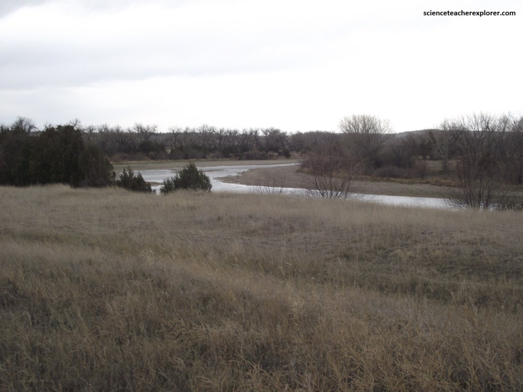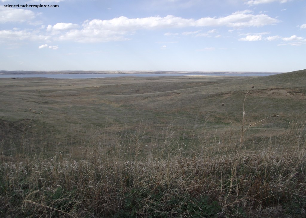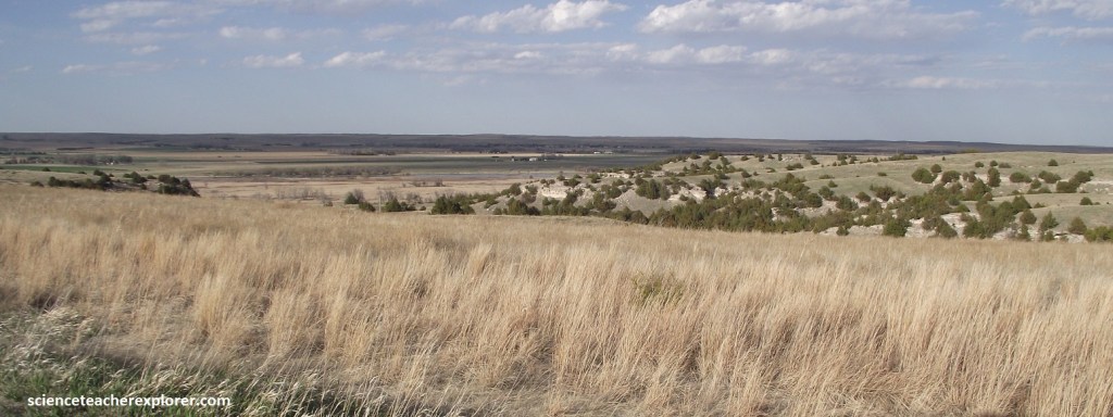 Following US 26 west of Ogallala took me up onto the Gangplank surface. The Gangplank is a high, smooth, and very gently sloping surface between the South and North Platte Rivers, and the portion of US 26 just south of Lake McConaughy is one to the best places to see it. Here, the surface is also known as the Cheyenne Tableland. US 26 climbed up to the Gangplank from the Platte River floodplain near Ogallala gulch, which is cut into the sediments that form the surface. Ogallala gulch may have served as a spillway for Lake Diffendal, (the earlier natural lake of Lake McConaughy) some 10,000 years ago, so that when water levels were high enough, water flowed over the divide and into the South Platte River.
