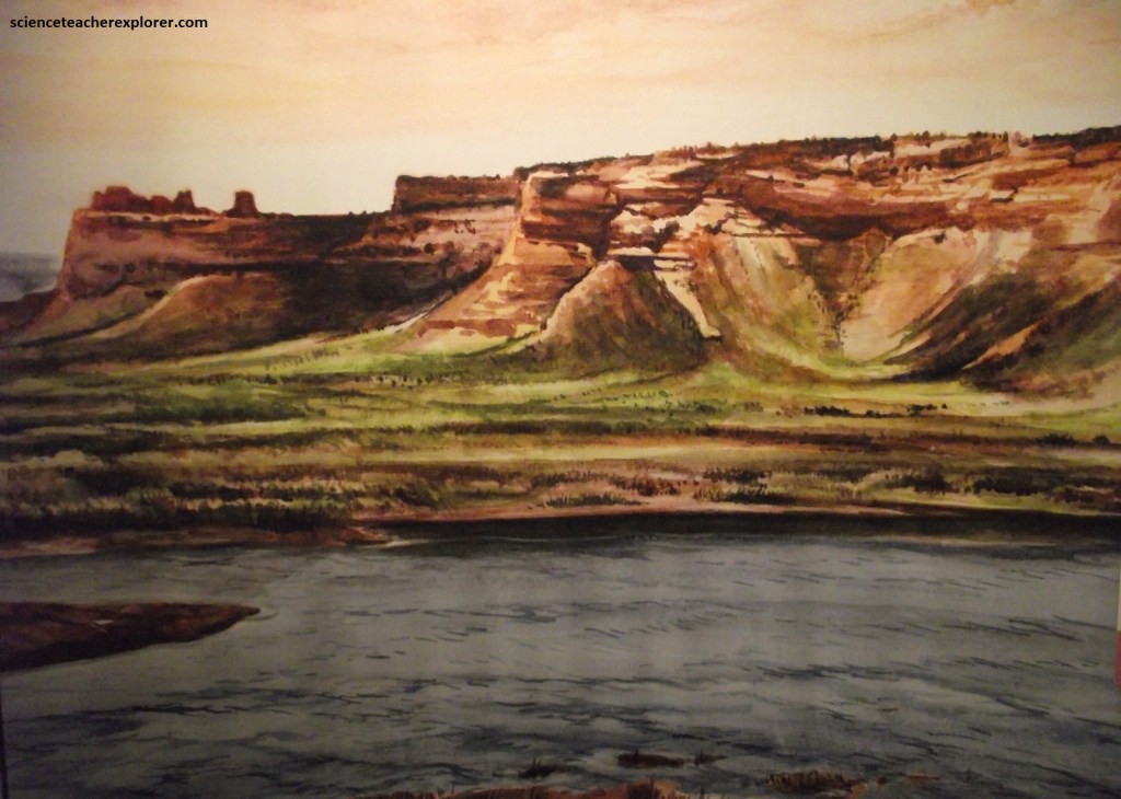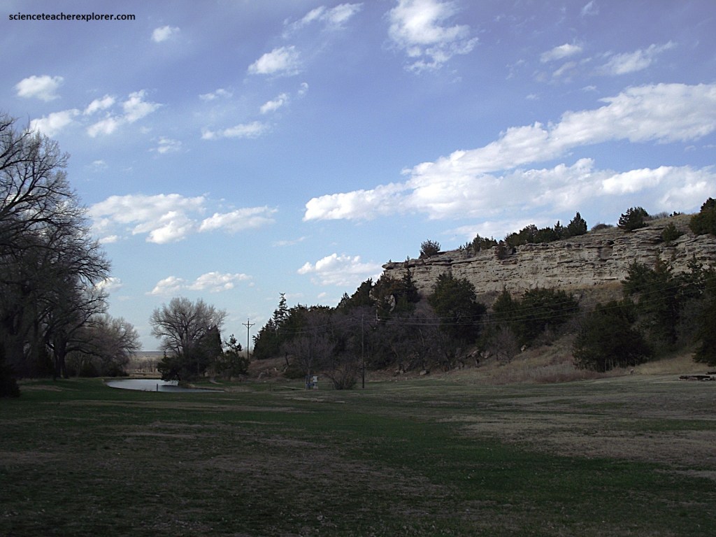 Pictured above, the Ash Hollow bluffs are carved into the Miocene-age Ash Hollow formation, which is the youngest formation in the Ogallala group. Capping some of the bluffs and forming very distinctive ledges are resistant horizons that are typically several feet thick. The multiple ledges of the Ash Hollow formation paint a picture of a cycle of deposition in a fluvial channel or floodplain environment followed by a prolonged period of stability, (probably thousands of years), during which time soil formed in the surface material. Fossils of camels, rhinoceroses, and archaic elephants occur in the Ash Hollow formation. 4 or more volcanic ash lenses that originated from volcanoes far to the west are interbedded with the Ash Hollow strata in this area. Two have been dated at 8 & 6.8 million years by fission-track methods. The 2 samples are separated vertically by 40m, and suggest a long-term sediment accumulation rate within the Ash Hollow formation of 33m/million yrs..