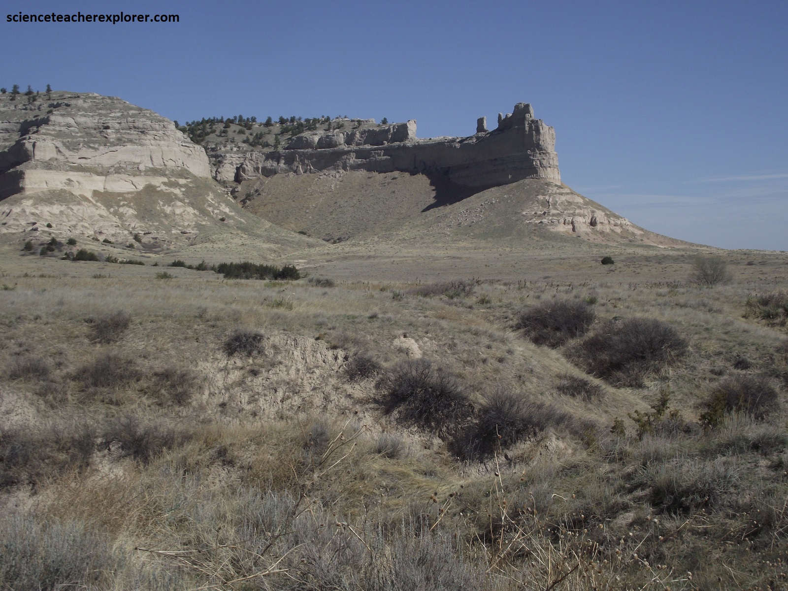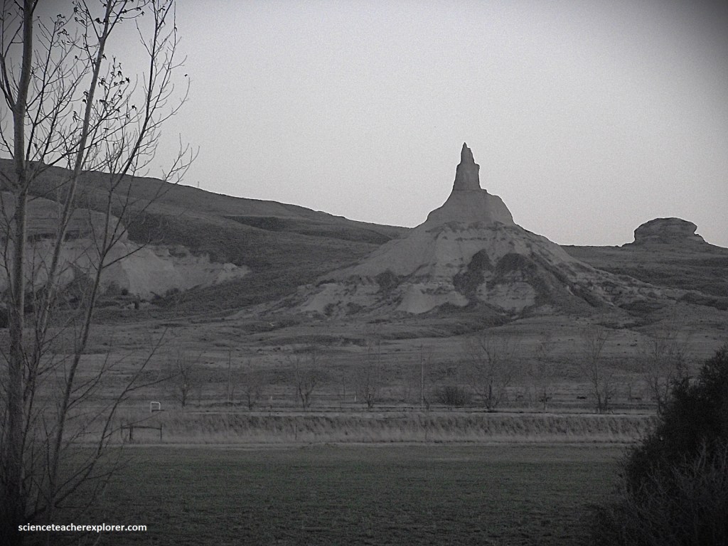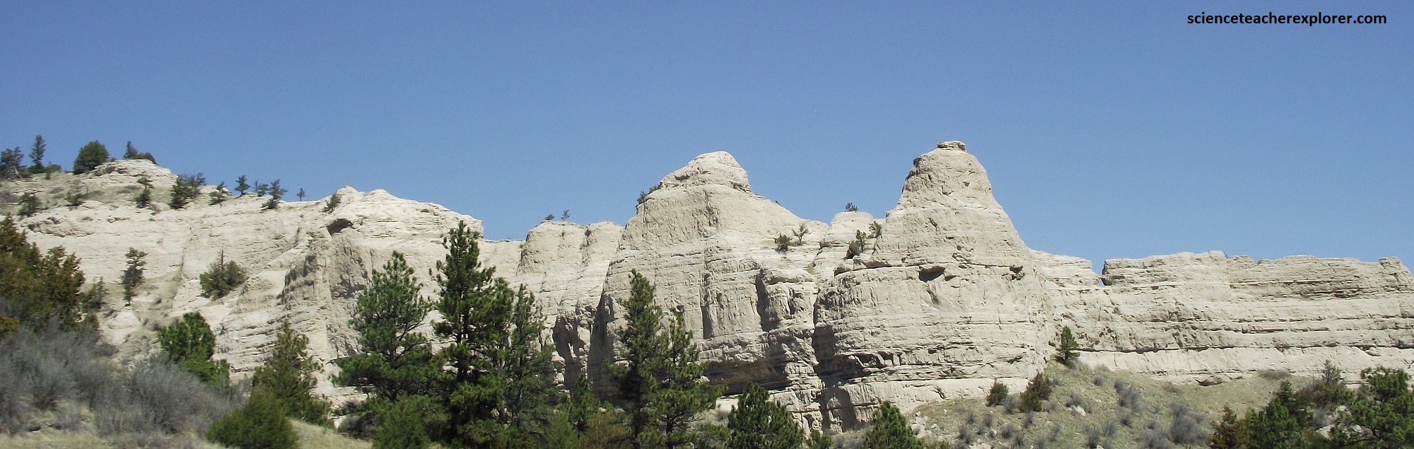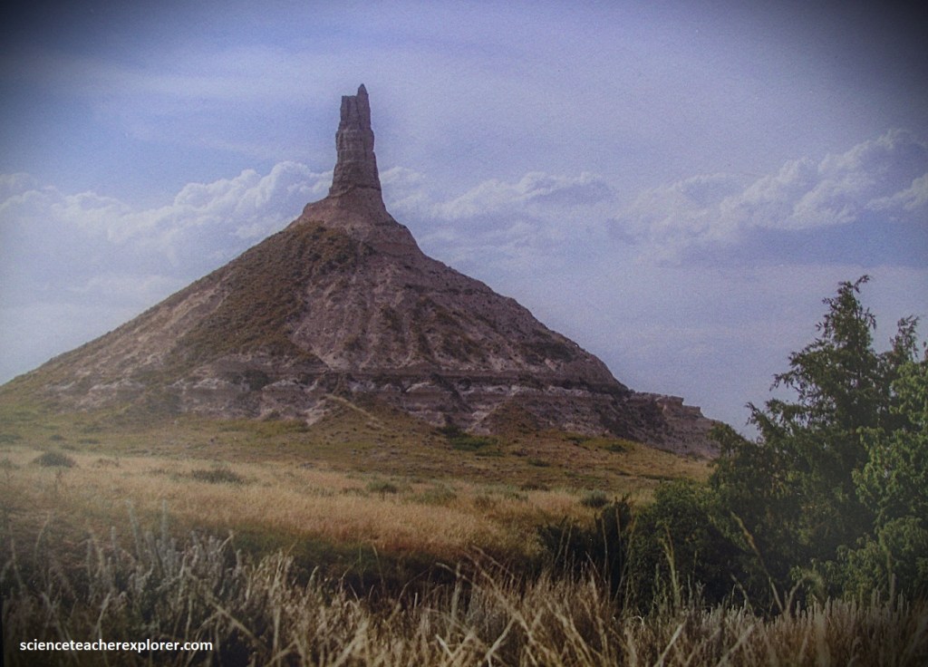 Pictured above, Chimney Rock is a pinnacle cut from Arikaree group strata. While it looks delicate, it has persisted since pioneer times, when it was an important landmark along the Oregon Trail.