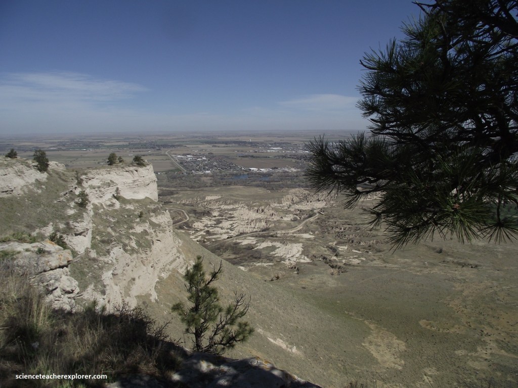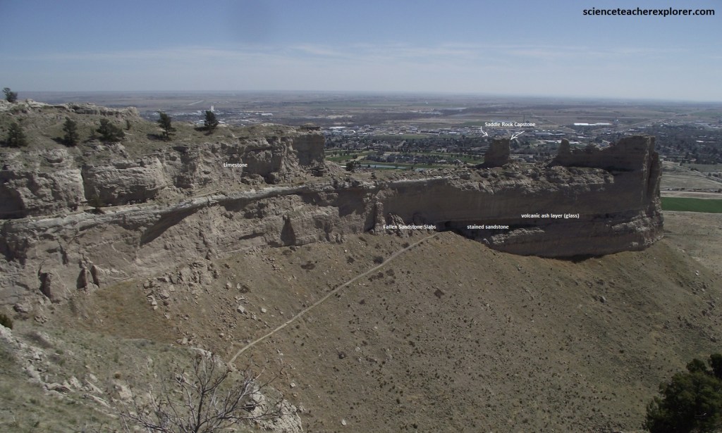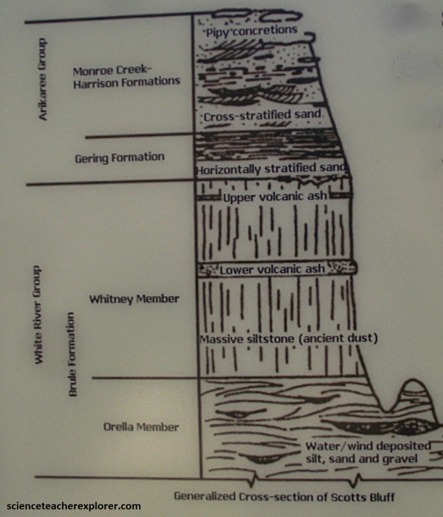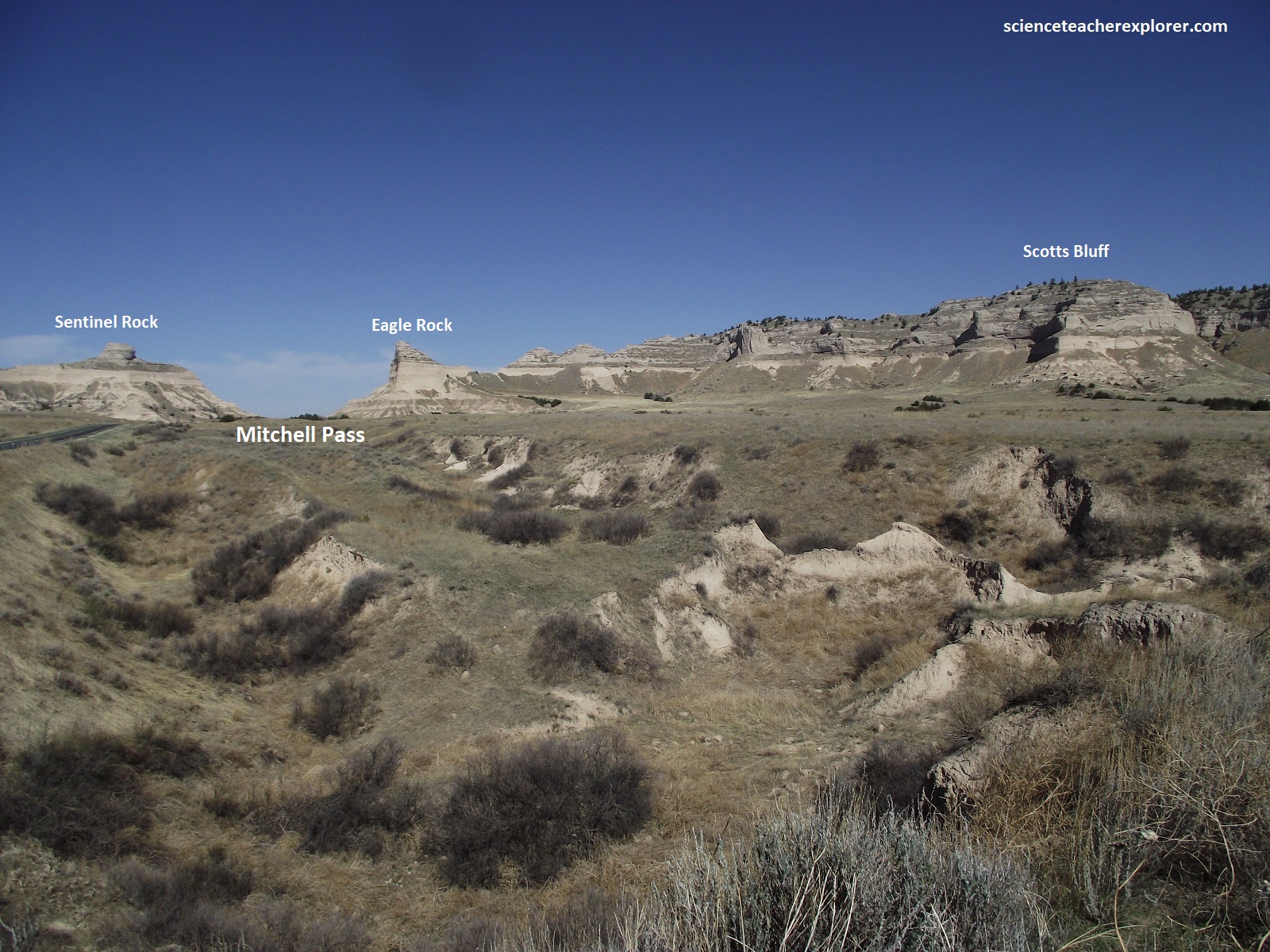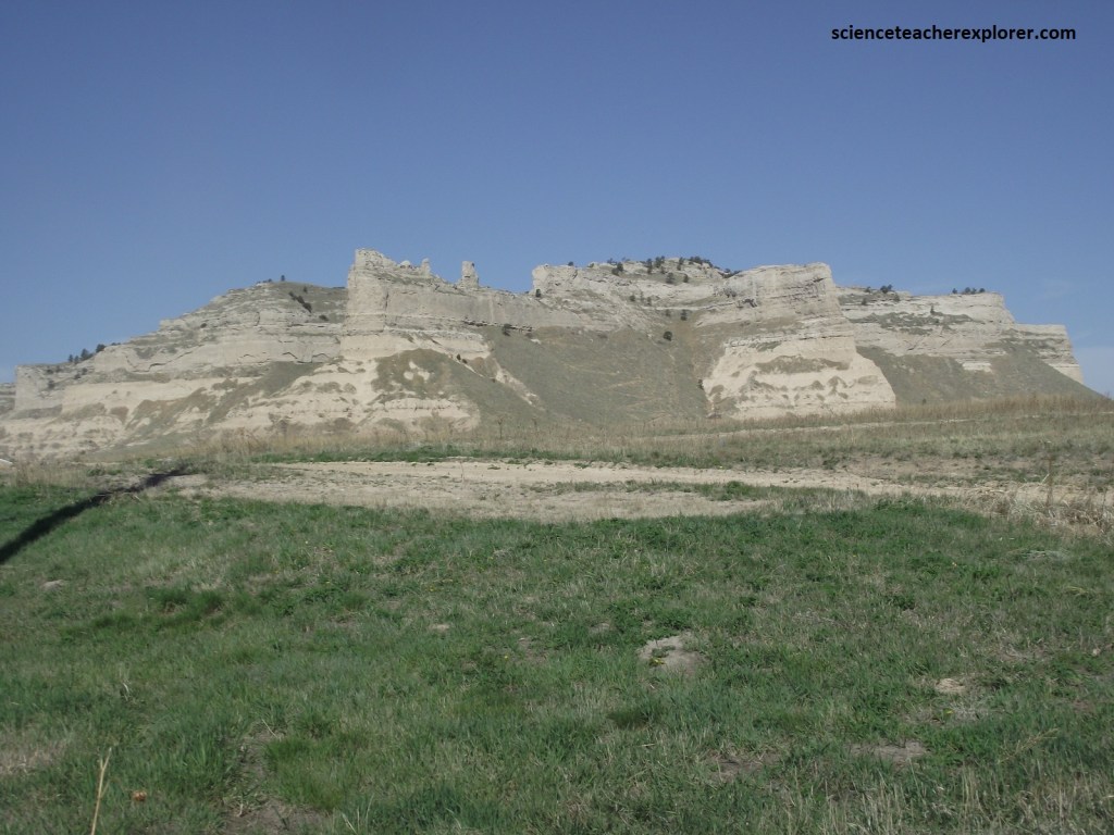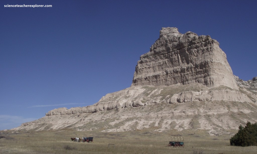 Named for Hiram Scott, an unfortunate fur trader who died near the base in 1828, the buffs were once part of a higher plain. Only a few elevations remain after rivers carried away the soft sedimentary stone which wind, water and humans continue to erode. Layers of sandstone, siltstone, Brule clay, volcanic ash and pipy concretions of limestone are exposed along the faces of the bluffs, telling the story of geologic processes in the area.