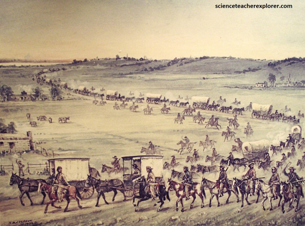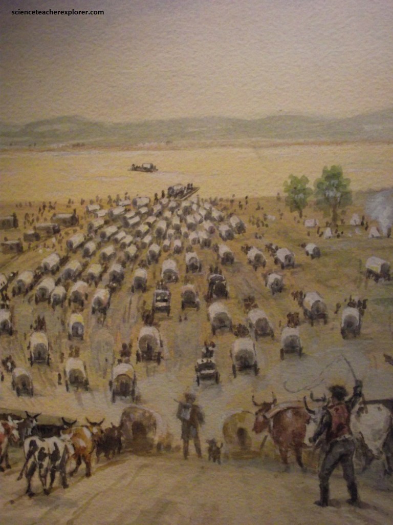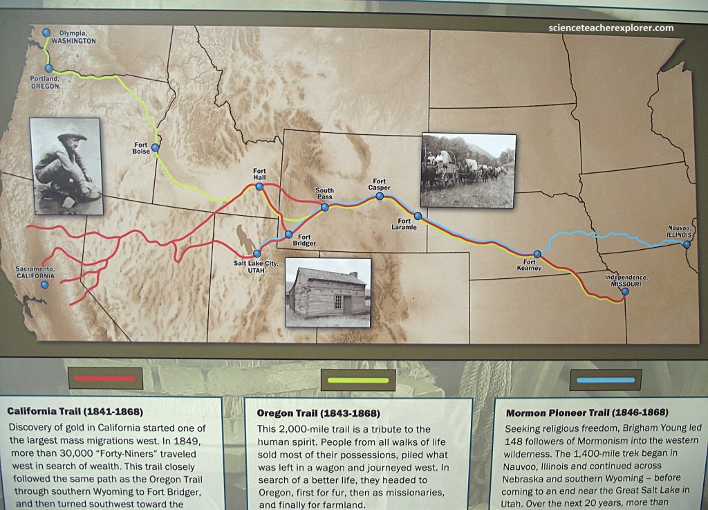 New territory in the Northwest, also drew families dreaming of rich farmlands, economic stability, and a desire for a new life. Trekkers on the Oregon Trail followed a route forged by trappers and missionary parties through the North Platte River area. Each day had a predictable schedule, (rise at dawn, eat, pack the wagons, rest at noon, travel till afternoon, set up camp, and make dinner.