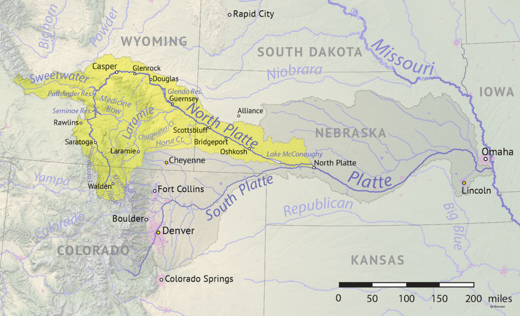 Imaged below, the Platte River has two forks, both originate in the high Colorado Rockies. I drove along the north fork of the Platte. The north fork and the south fork join in western Nebraska and eventually flow into the Missouri River.