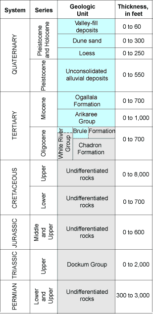 A well-defined series of old channels, filled with sediment up to 100m thick, parallel the road at distances from several hundred meters to 2 km. These represent an ancient river system similar to the Platte, parallel to but higher and offset to the north from the modern river.