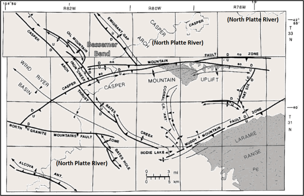 Through present-day Casper & the Bessemer Bend area, the trail passes through the eroded cores of anticlines, (huge arching folds of rock strata), and through synclines, the reverse of anticlines, where the strata bow down in the middle. Image below, is a geological map of anticlines and synclines along the North Platte River. Anticlines & synclines are prime locations to explore for petroleum reservoirs in the Cretaceous Mowry Shale.