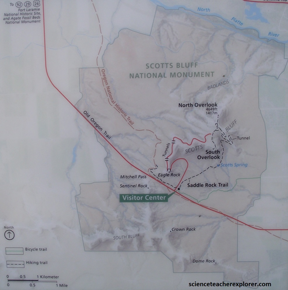 Pictured above, a short drive south of US 26 on NE 88, Courthouse Rock is a pleasant diversion and is easily accessible. Hundreds of overland emigrants mentioned Courthouse Rock in their diaries. Often called a “castle” or “solitary tower,” the name Courthouse was first used in 1837. Courthouse and Jail Rocks, rising some 133m above the North Platte Valley, are erosional remnants composed of clay, sandstone, and volcanic ash.