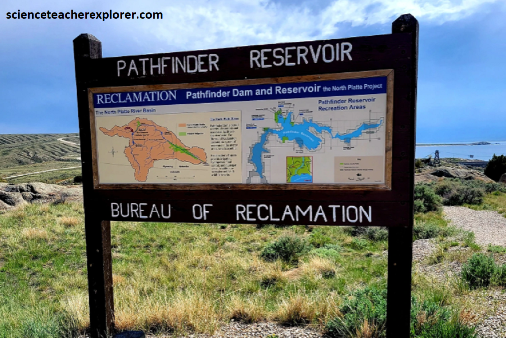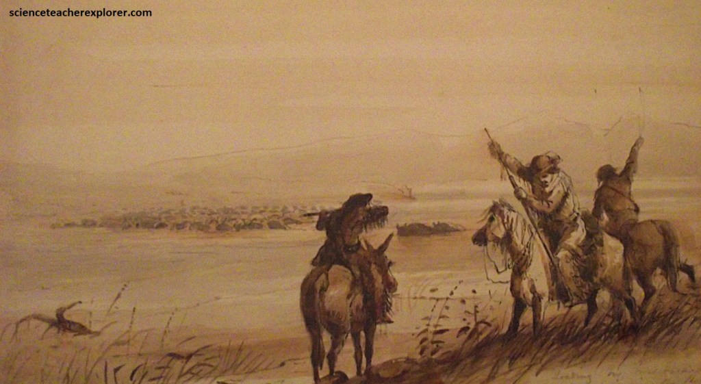 Eighty kilometers and 3 days’ travel south west from the Bessemer Bend or the North Platte River crossing, the emigrants reached the banks of the Sweetwater River. The valley of the Sweetwater points like and arrow west to South Pass, (the halfway point of the journey). Note that the confluence of the North Platte River and the Sweetwater River is now the Pathfinder Reservoir, (picture below).