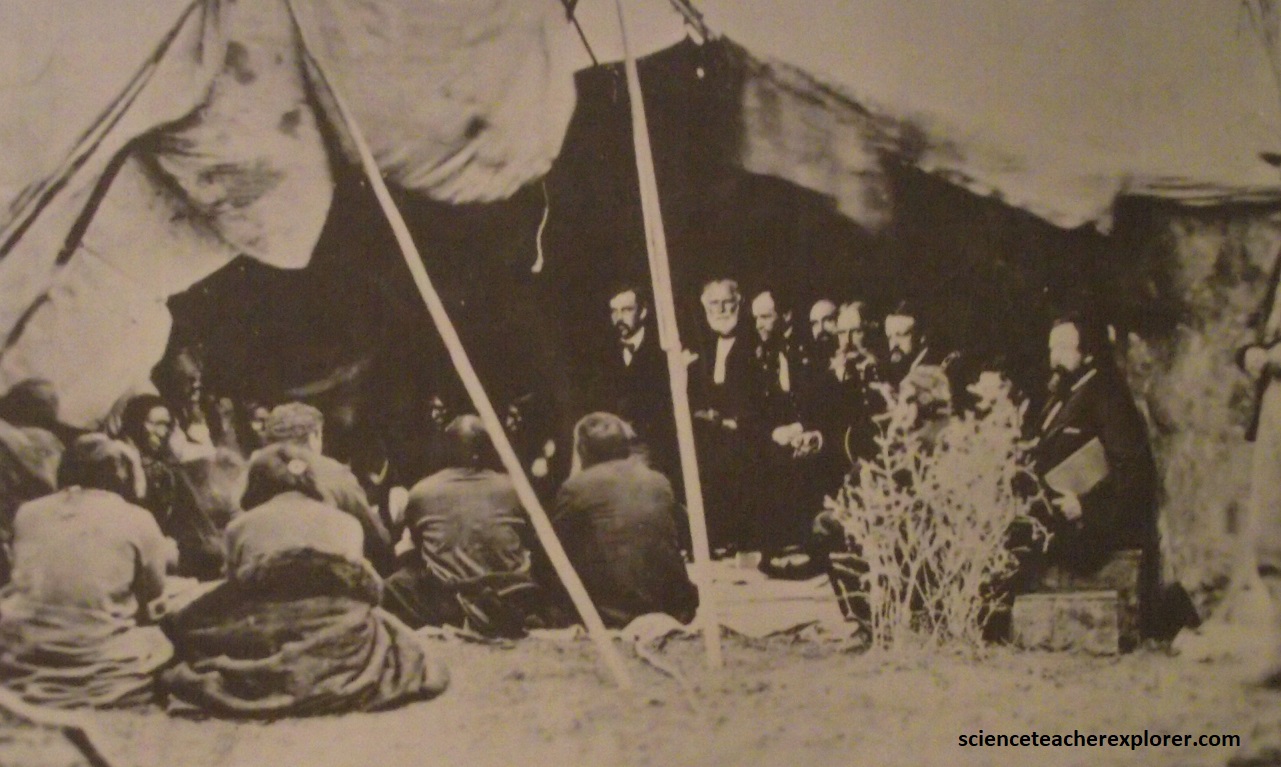 At the outbreak of the Civil War, troops were withdrawn from most western forts and sent east. Volunteer units at Fort Laramie face the daunting task of keeping hundreds of miles of telegraph line and the Central Overland mail route open and operating. Between 1864 and 1868, Native Indian attacks on military outposts, telegraph stations, mail stages, and civilians increased. The opening of the Bozeman Trail infringed on Native territorial rights. By 1868, Red Cloud and his Sioux warriors had force the abandonment of the “bloody Bozeman” and driven the federal government to the peace table once more. {The historical photos below were taken in 1968 at Fort Laramie during the Sioux and Lakota Peace Treaty meetings, (image taken from an interpretive sign on-site)}.