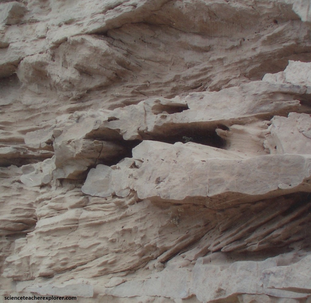 Pictured above, the lower parts of Jail Rock are the massive clay siltstones of the Brule formation. Above are Arikaree group sediments with ash horizons and sands with a plethora of cross-beds and channels. Cross-beds form whenever a flowing medium, such as water or wind, deposits sediments in ripples, sandbars, or dunes.