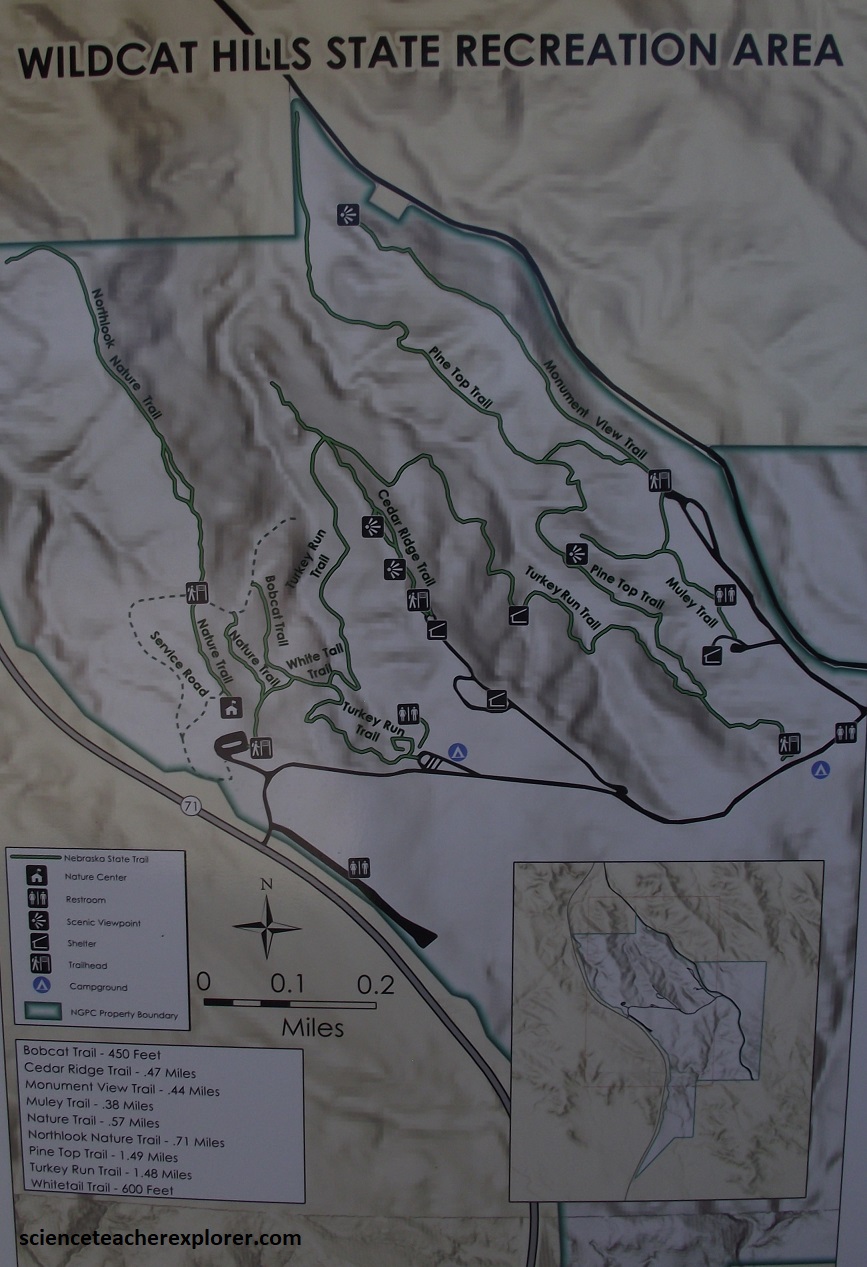Driving northwest on NE 92, I came to the small town of Gering, Nebraska where I turned left, (south) on NE 71. After 16 km, I approached the Wildcat Hills & Ridge. Pictured above, encompassing 935 acres of rocky buttes and forested canyons, the Wildcat Hills offered 4.8 km of rugged hiking trails, stone shelters with fireplaces, and a magnificent view of the North Platte Valley.