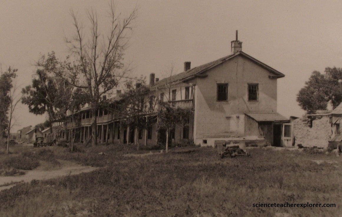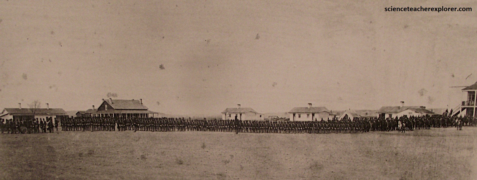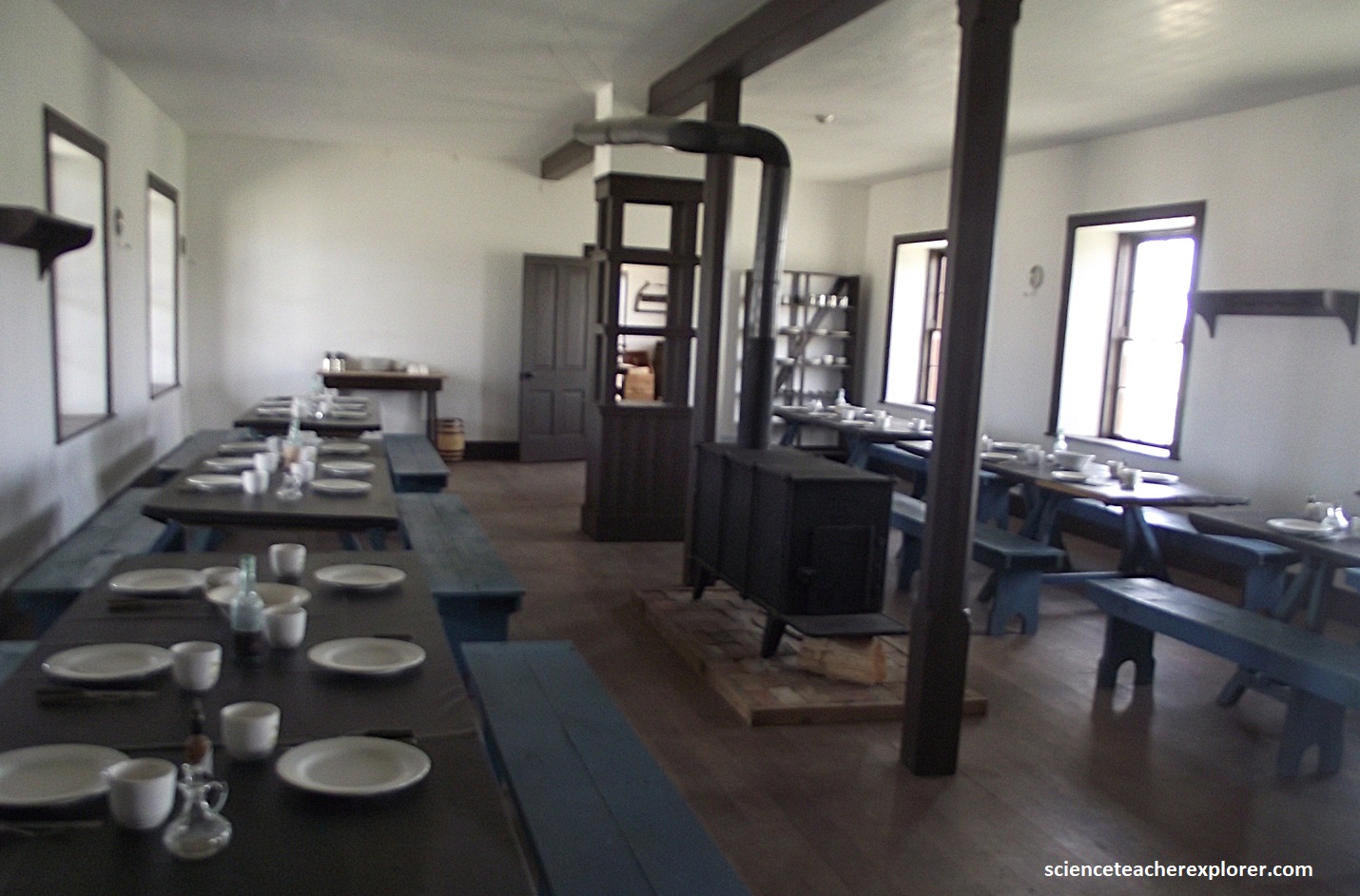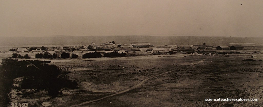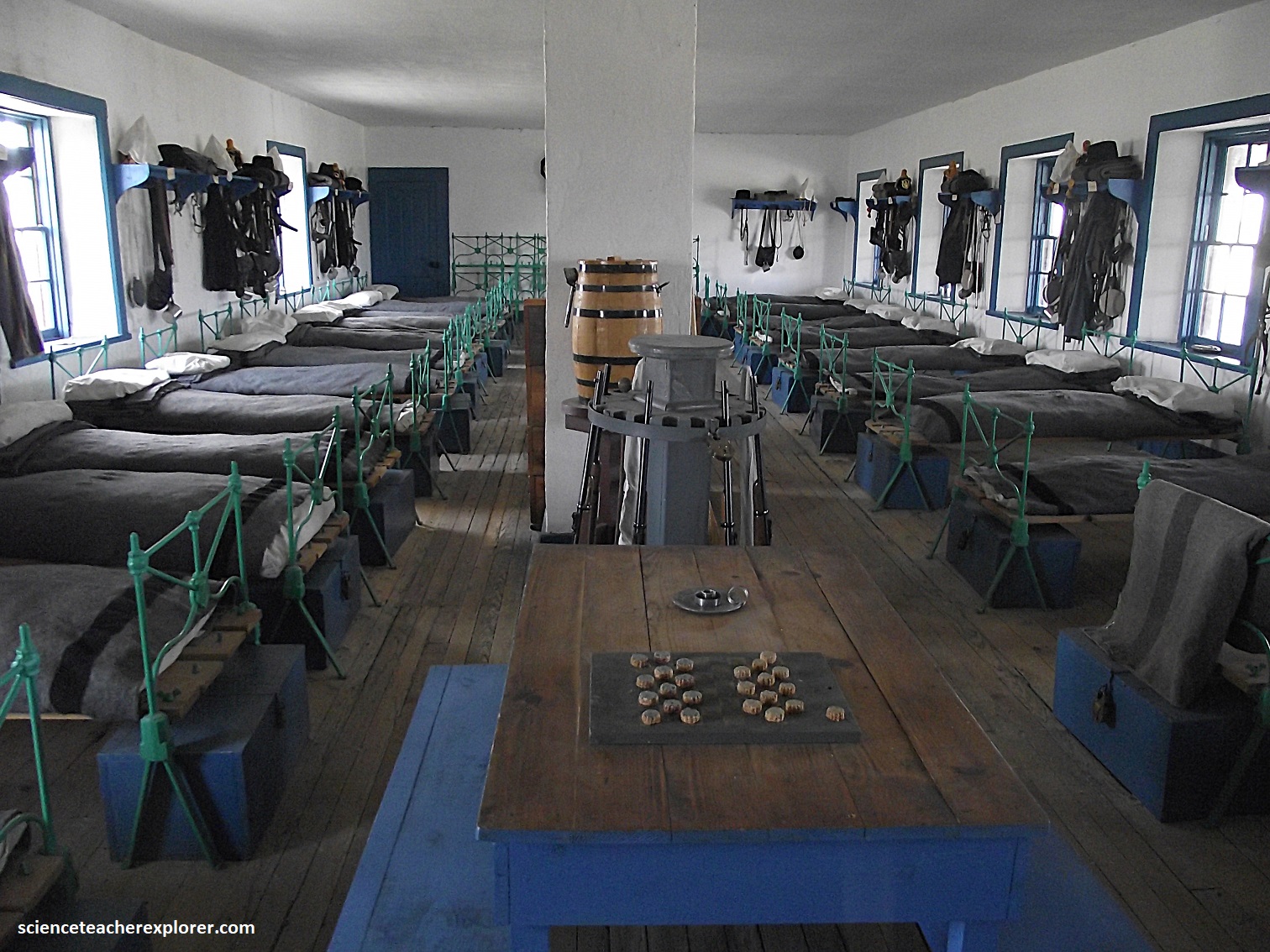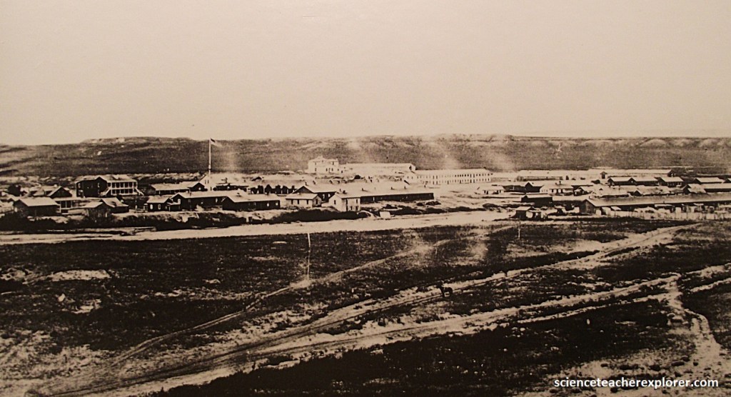Picture above, is the only surviving enlisted men’s barracks at Fort Laramie. {The historical photo was taken from an interpretive sign on-site and said to be taken in the early 1900s}. The building proper was completed in late 1874 and was designed to provide quarters and other needed support facitities for two companies of soldiers. The veranda, although originally planned, was not added until 1883. As constructed the entire second floor was made up of only two equal, large rooms. These were the company dormitory bays or squad rooms were the enlisted soldiers lived. Each could house about 60 soldiers or one company. On the first floor below each squad room, the building was divided into a kitchen, messroom, cook’s room, storage room, wash room, library, armory and orderly room for the N.C.O.’s and non-commissioned officers room.