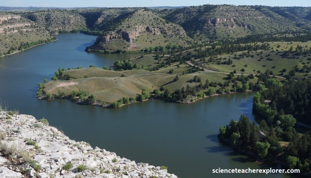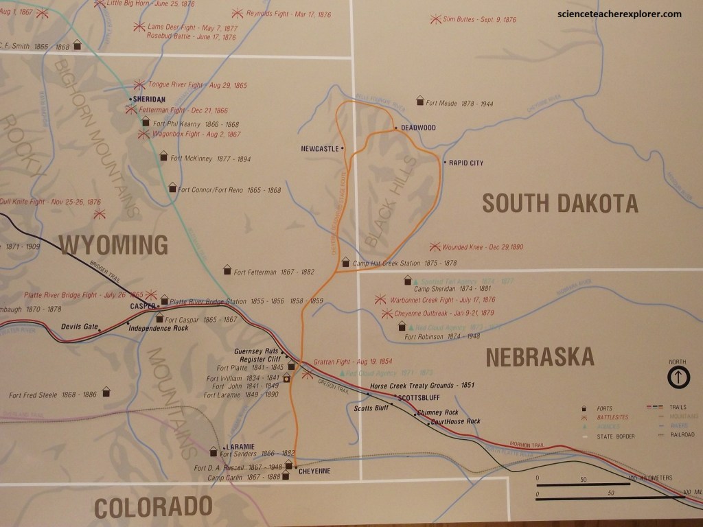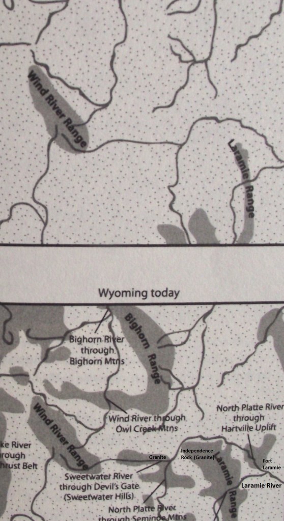 The detour through the hills comes where the North Platte river crosses the Hartville Uplift, (a broad hump of arching rock strata, 48 km across, rising like an oval blister on the land. The river, rather than taking an open route around the uplift to the north, slices straight through it, cutting three deep canyons in quick succession between today’s towns of Orin & Guernsey, Wyoming, (pictured below).