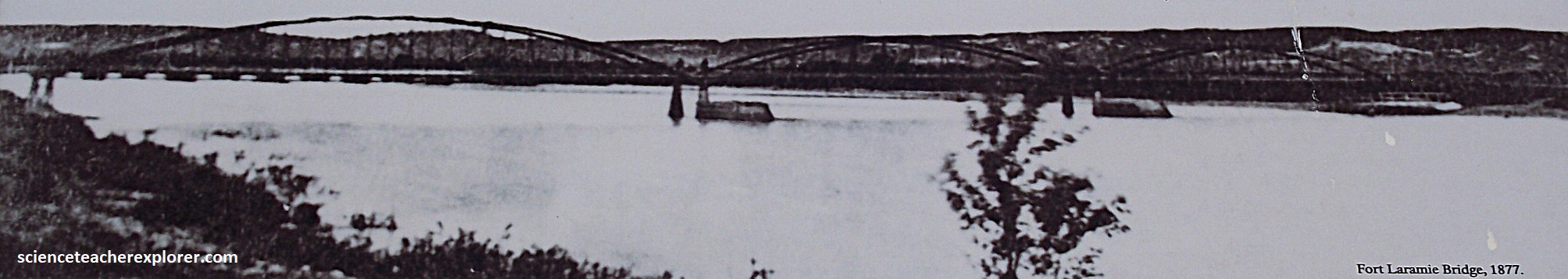 Pictured above, once broad and turbulent, the North Platte River posed a formidable obstacle to 19th century travelers. High water made it nearly impossible to cross the river for several months each year. The crossing became less dangerous by 1850 when ferry service was established to meet the growing volume of military and emigrant traffic. Frequent ferry accidents and slow crossing speeds continued to impede travelers until a permanent bridge was built. The triple-span Fort Laramie Bridge was constructed between 1875 and 1876 for $15,000. Rubble filled, log ice breakers protect the unique I-beam piers supporting the bridge. Spanning 134m, this bridge is the best-preserved King Iron Bridge patent tubular bowstring bridge in existence. {Note the historical photo above is taken from an interpretive sign on-site}.