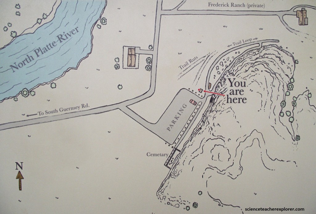 In the evermore-dissected terrain, emigrants had to veer away from the North Platte River for long stretches, with tough pulling over hills and across ravines. Two kilometers south of present Guernsey, Wyoming, an outer bend of the river runs up against an 27m high bluff of Arikaree sandstone, (Late Oligocene & Early Miocene). Unable to pass along the riverbank, everyone had to climb up and over the bluff. All wagons followed the same narrow track over the bluff, excavating a 2m deep defile today called Deep Rut Hill, (pictured above).