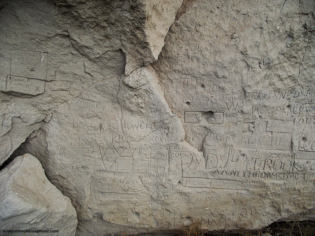 Pictured above, a few kilometers away, on the inside of a wide bend in the North Platte, stands Register Cliff, (a long wall of Arikaree sandstone riddled with emigrant signatures). The soft rock is easily gouged with a stick or knife, and emigrants often carved their names with great calligraphic flare.