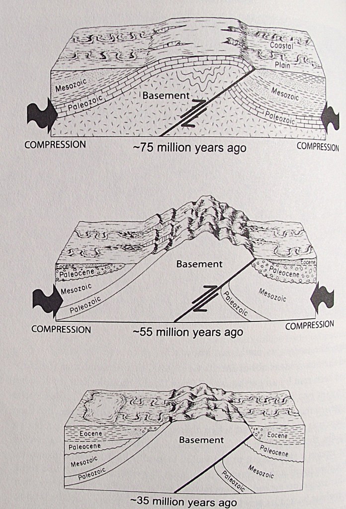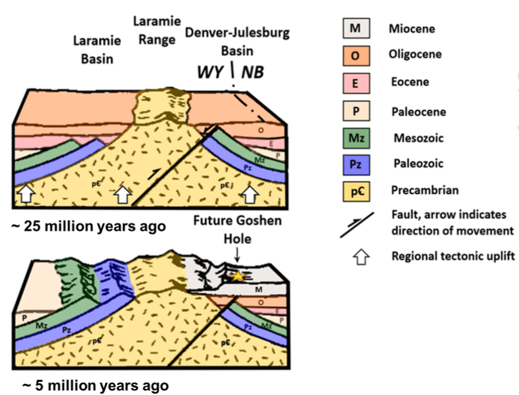 The Foreland Ranges, (Hartville Uplift, Laramie Range & the Wind River Range), began to rise about 75 million years ago in response to sideways compression of Plate Tectonics. Rock debris eroding from the mountains filled up the valley and continued to do so after the ranges stopped rising, (imaged below).