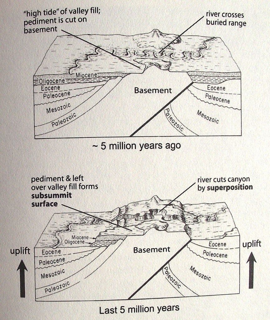 By about 5 millions years ago, the debris had nearly buried many of the mountains. Rivers established paths across the buried mountains, and pediments were notched around some of the exposed peaks. Eventually the rivers sliced through the once-buried mountains, and the pediments were raised to their current elevation to become today’s sub-summit surface that the pioneers used to travel on, (imaged below).