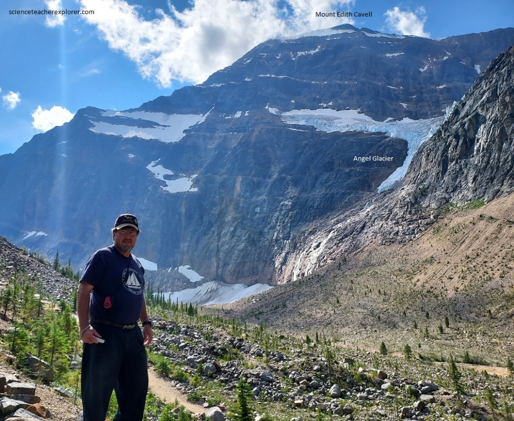 Pictured above, Angel Glacier lies in a saddle area on the northeast slope and sends a tongue of ice over the cliff-side. In very recent times it reached continuously to the valley bottom but has been steadily shrinking so that it now hangs suspended on the rocky wall as a sort of immobilized icefall. Below it are large cones of debris mixed with ice, and a flush of meltwater issues from the bottom of the ice tongue. A triangular area of rock more lightly stained than that around it suggests the former shape of Angle Glacier. “Lateral moraines”, (piles of rock waste left along the sides of glaciers), occur along both sides of the valley above the end of the road and parking lot. Some of these are very steep sided towards the ice, and show clearly on their backs that they were pushed up against the banks there.