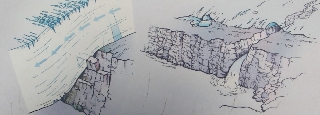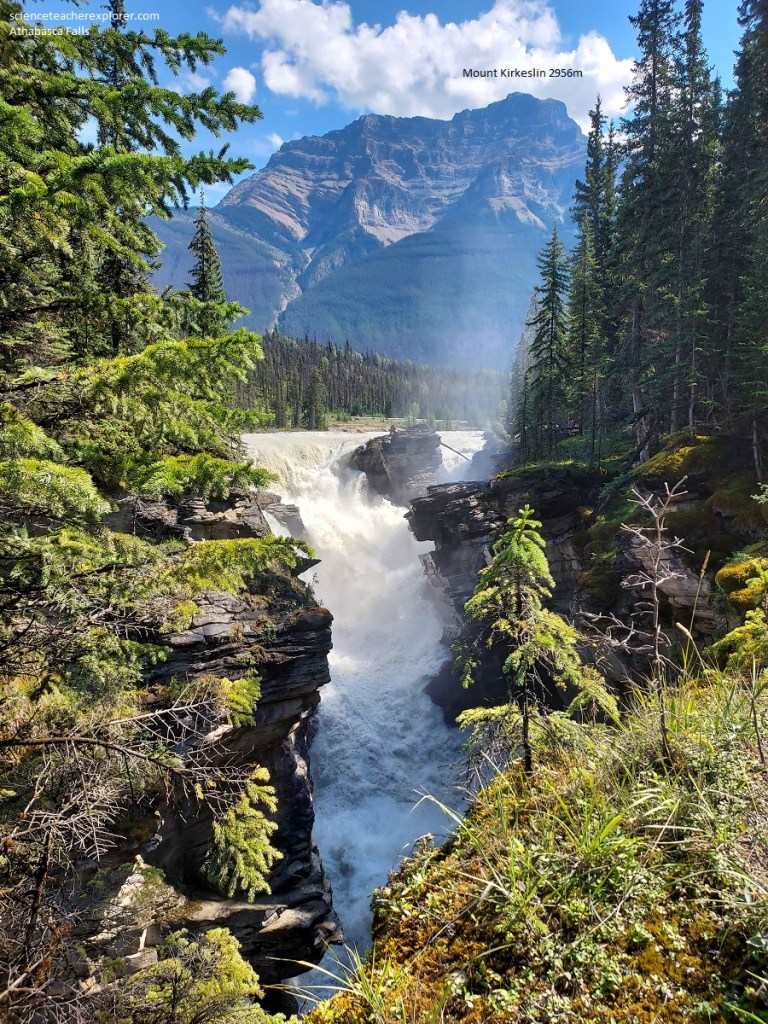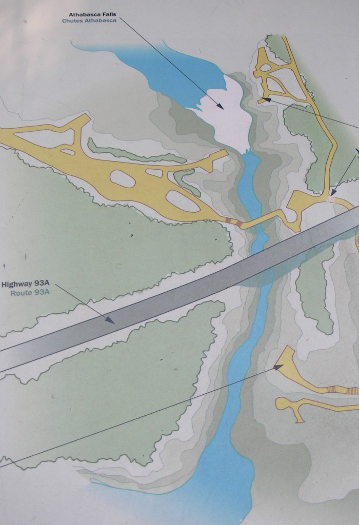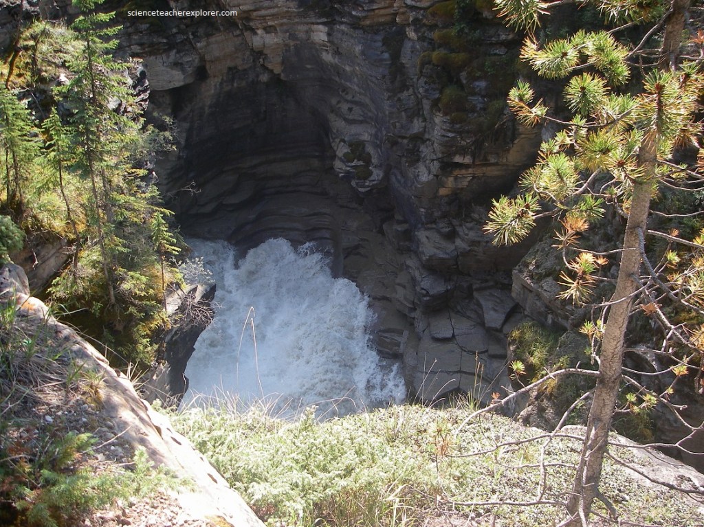 At the falls itself we find a place where the Sunwapta River changes course sharply from northwest to southwest and then plunges over the falls into a deep canyon. Pictured below, it seems likely that the river has been pushed out of a pre-glacial valley by glacial damming. The falls resulted when the river flowed over the edge of ready-made cliffs, and since then it has gradually worked its way back by erosion to form the canyon.