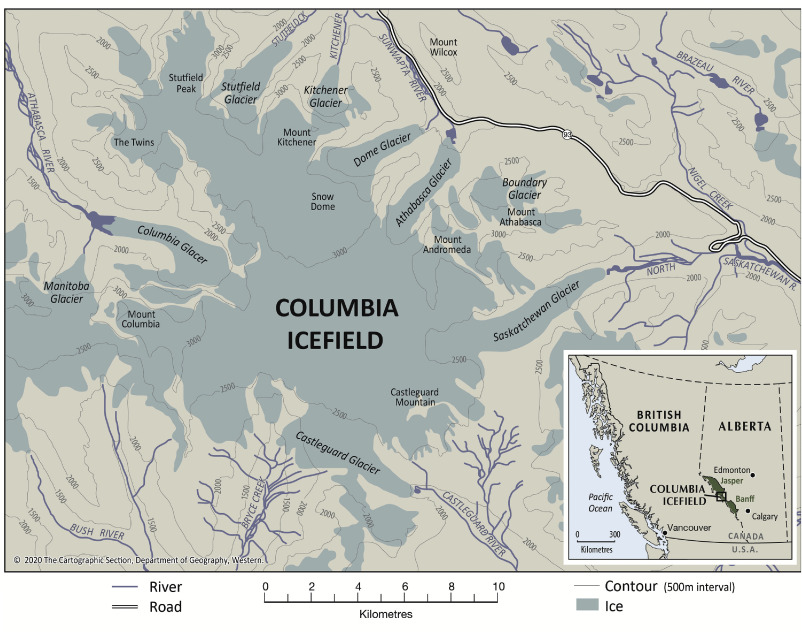 Tongues of the ice from the Columbia Icefield move down three principal valleys, as the Athabasca Glacier to the north east, the Saskatchewan Glacier to the east, and the Columbia Glacier to the northwest. Numerous other small outlets from the central reservoir spill over into the surrounding valleys.