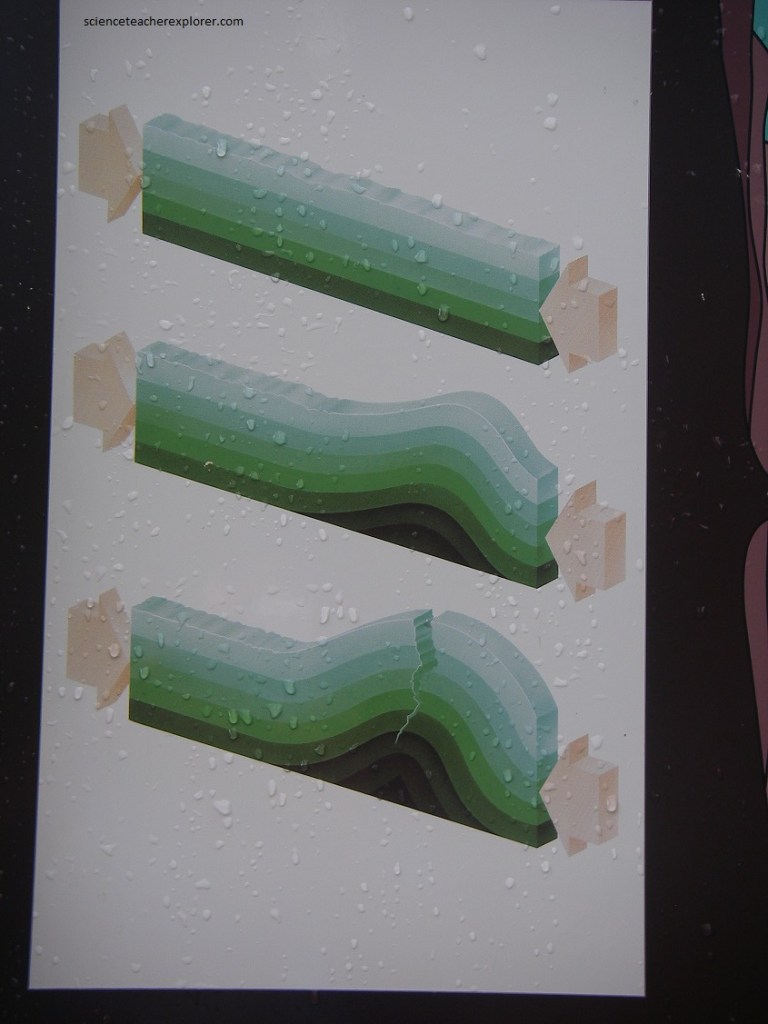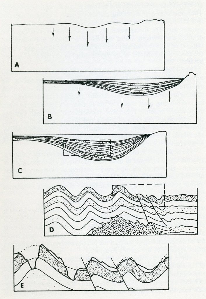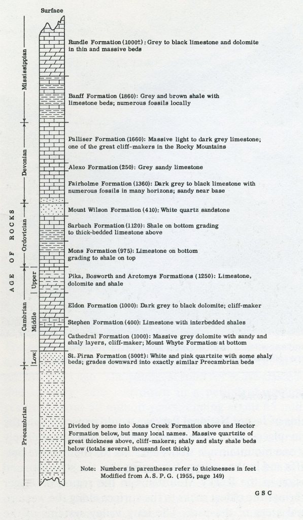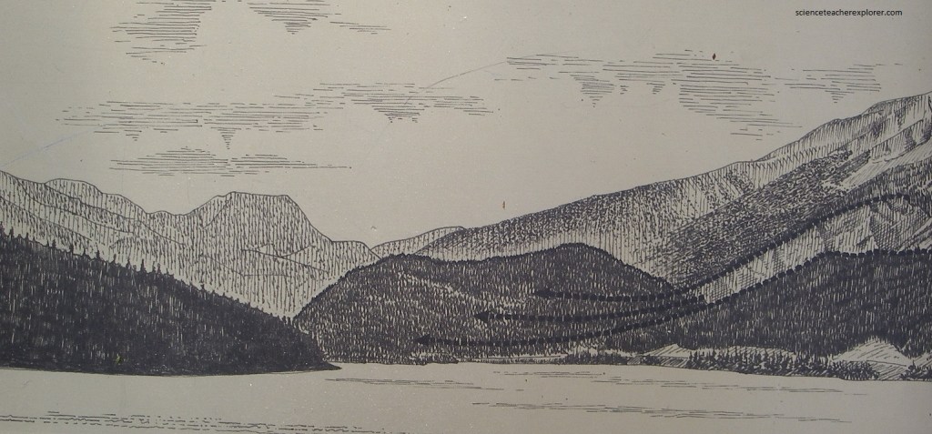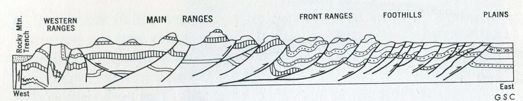 The spectacular peaks and valleys of the Canadian Rocky Mountains as we know them today are made of rocks which record a story that began more than 600 million years ago. At that time part of western North America began to warp downward to form an elongated trough as in “A” in the above image. Rivers poured sand, silt, and gravel into the lowland area. Down-warping continued until the trough was filled with a shallow sea, into which poured a steady flow of sedimentary materials, as in “B” in the above image. Down-sinking continues, but it seems to have been at a rate that corresponded closely to the rate of filling, so that sedimentation was always into shallow marine waters. The mass of sedimentary materials slowly changed to sedimentary rock as the load on top increased until it had a form like that in “C” of the above image. The main period of mountain-building was between 80-60 million years ago during the Laramide Orogeny. The trough area was then severely compressed so that the rocks in it were folded and broken. At about this time in the history of such mountains great masses of molten materials commonly appear in the cores of the folded and broken, eventually solidifying into granite. “D” is a depiction of this, in the image above. Uplift accompanied the folding and faulting, and as soon as the rocks emerged from the sea they were subjected to erosion. Rivers and glaciers carved the valley and formed the peaks as shown in “E” in the image above.