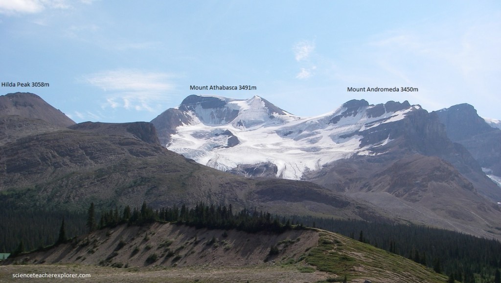 Pictured above, the Sunwapta River valley bottom and above it to the foot of the foot of the ice of Athabasca Glacier itself, is choked with glacial debris left there by the glaciers or washed into it by meltwaters in the time since they retreated. As the photo above looks southward up the valley, the snow-covered from this point, the snow-covered peak of Mount Athabasca dominates the skyline. The glacier which it sends down its northward face has several beautiful icefalls on it. It gives the impression of being a thin veneer of ice draped over the rounded rock surfaces, and this confirmed in the lower regions where several “bosses” of rock show through the ice. Beyond that, Mount Athabasca shows three glaciers with icefalls, snowfields in their heads, and great cracks or “bergschrund” showing high up where the snow and ice have started to pull away from the steep back walls.
