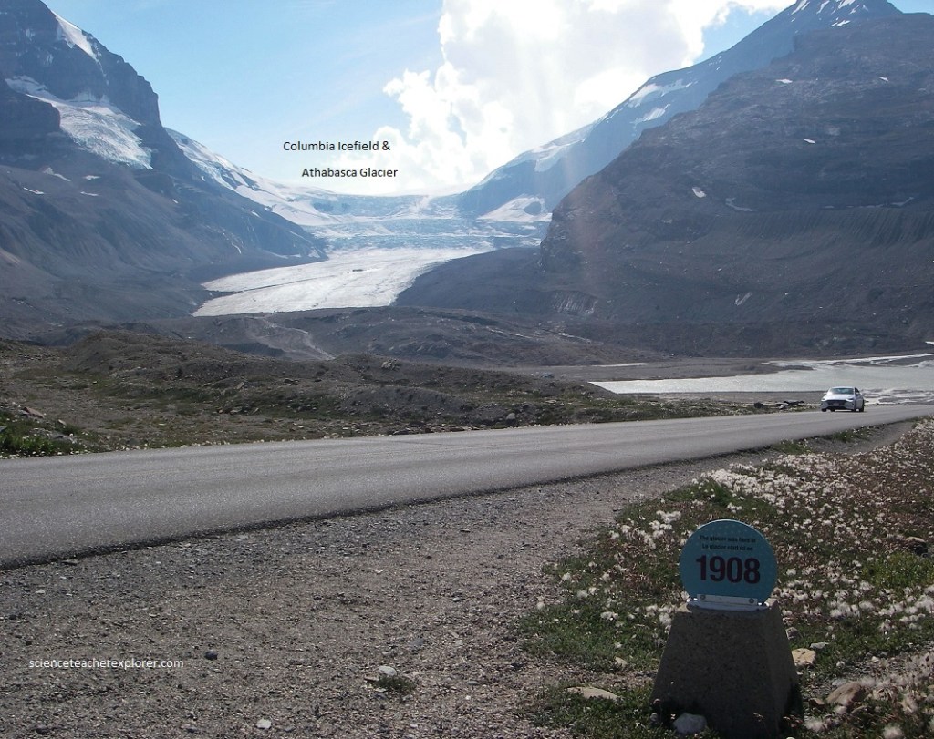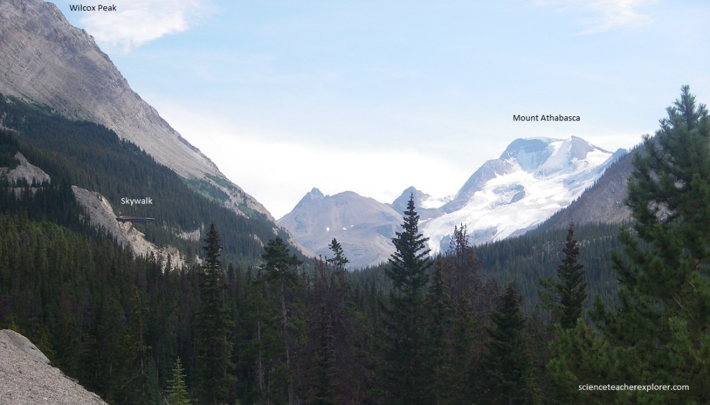 Pictured above, the Columbia Icefield can be seen rimming the mountains farther to the north. In the main valley to the north, Dome Glacier is formed by the refreezing together of reconstitution of ice and snow which fall over the cliff at the back of the valley. In the bottom of this valley a great mass of rock waste, tongues of ice, meltwater streams, and sharp-ridged lateral moraines can clearly be seen. These hills to the north and east of the parking lot lie close to the center or axial part of a downfold or syncline. The relationship means that younger rocks appear in the hells back of the parking lot and older older rocks in the mountains across the valley.
