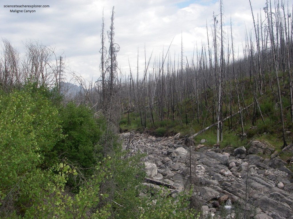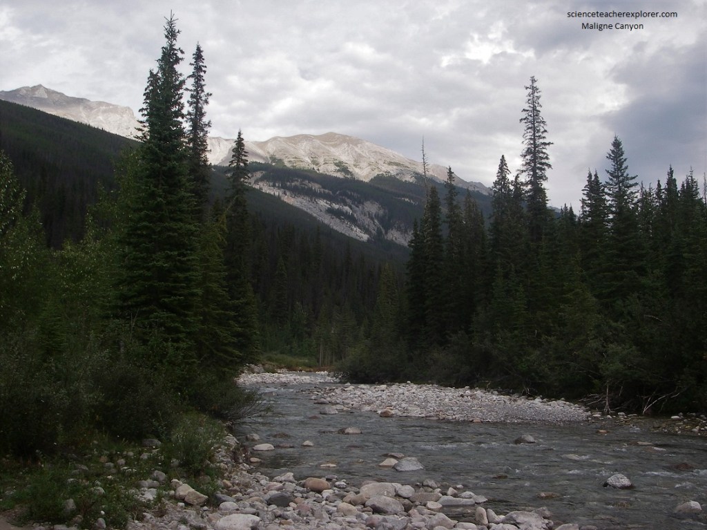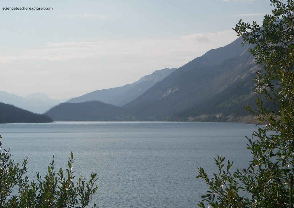 After staying the night at the Jasper village, Becky and I explored the nearby Maligne Canyon drainage system. This drainage valley is about 80 km wide and empties into the Athabasca River via the Maligne River in a little more the 5 km below the village of Jasper, at an elevation of about 1,006 meters above sea level. It’s principal reservoir is Maligne Lake, about 40 km above its mouth and 1,674 meters above sea level. The river thus has an average gradient of about 15 m/km, which is very steep. Medicine Lake lies in the course of the river about 16 km above its mouth at an elevation of 1,448 meters above sea level.
