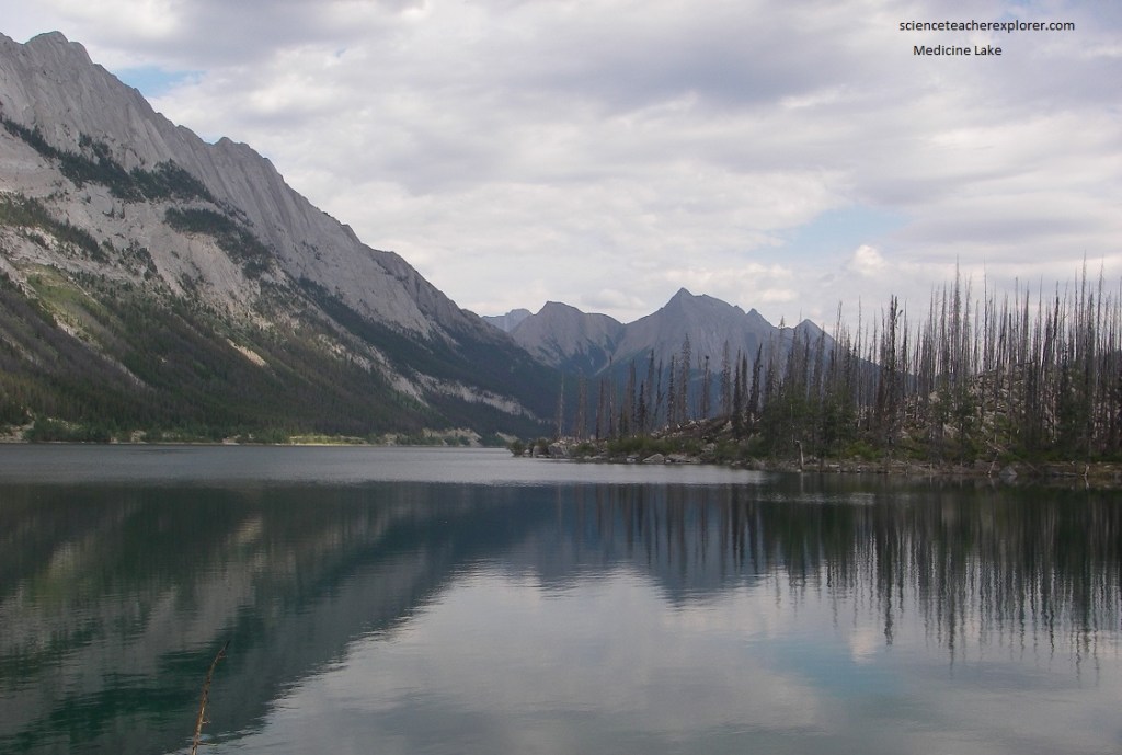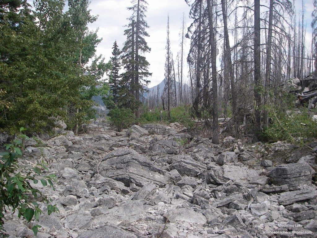 Pictured above and below, the mound toward the far end of Medicine Lake is the remnant of a massive rock slide. There, several hundred years ago, a large section of steeply dipping bedrock crashed down into the valley from the mountain to the east.
