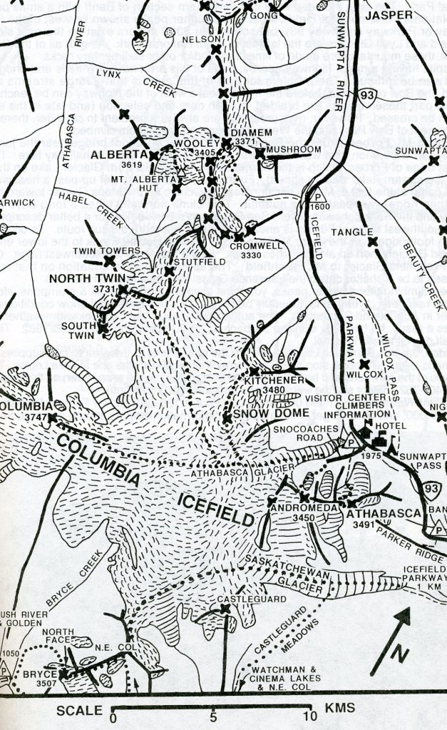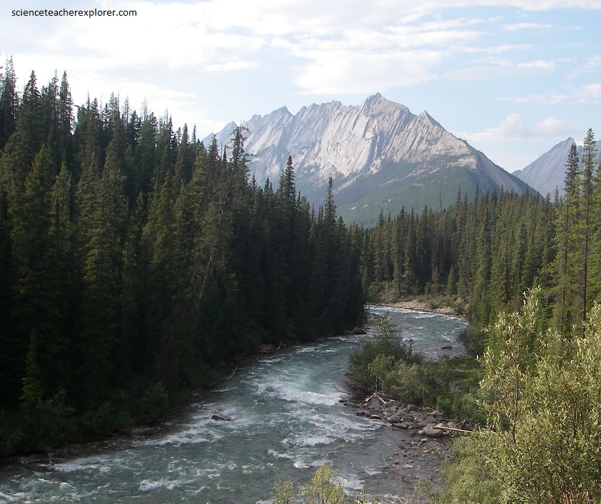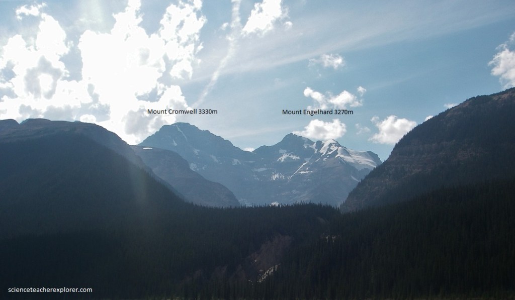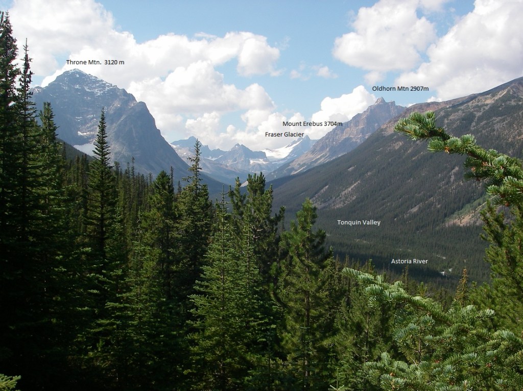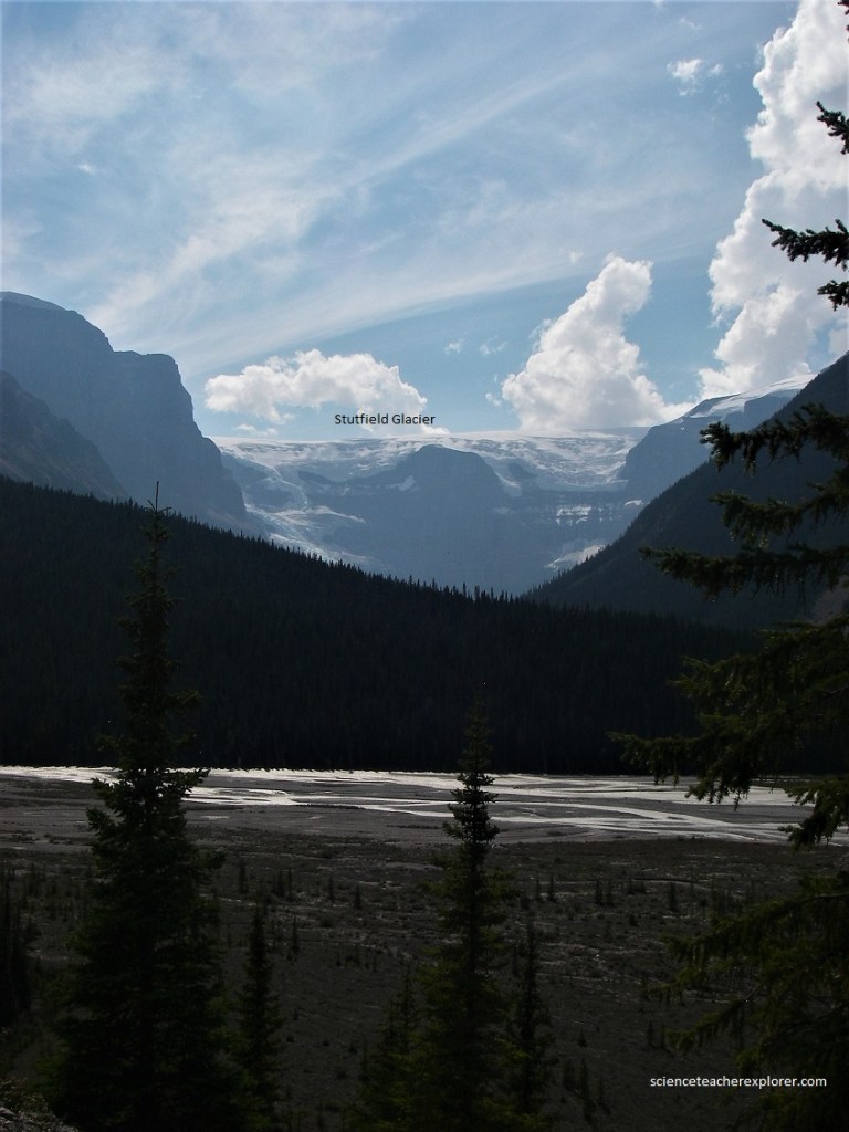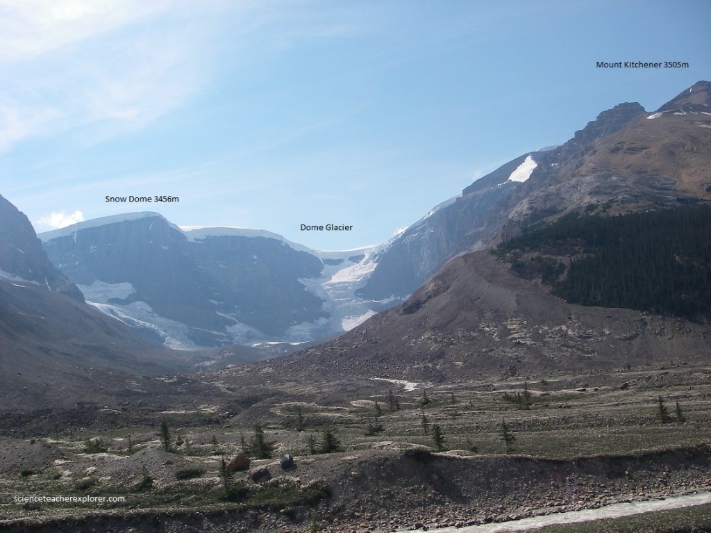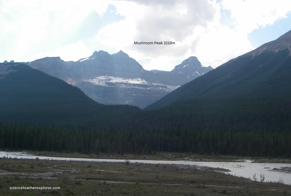 Pictured above, a good example of a braided river flat, (a valley bottom filled with sand and gravel with a river spread across it in interlacing channels. Glimpses of the Columbia Icefield can be seen along the edges of the mountains. A superb double set of icefalls occurs on the steep back wall of Stutfield Glacier. Most of the main glacier in the bottom, made by reconstitution of broken ice below the icefalls, is hidden by the intervening wooded ridge. Mount Kitchener is to the left of Stutfield Glacier and shows the edge of the Columbia Icefield in cross section all along its crest, like the icing on a cake. High on the shoulder of the mountain, a bowl-shaped depression or “cirque”, formed by glacial cutting, lies close enough to the edge so that its terminal moraine material has poured over the shoulder of the mountain to make a tall scree slope.