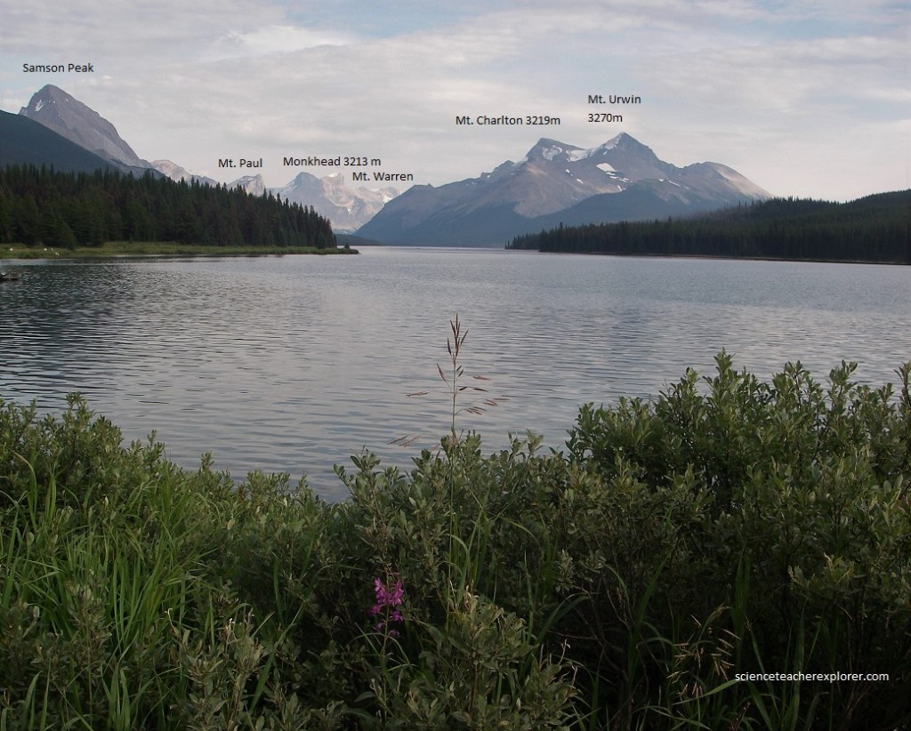Pictured above, Maligne Lake itself is the result of the deepening of the upper end of the valley by the glaciers and the damming of the valley by sand, gravel, and rock rubble in the vicinity of its present northwest end. Depressions call “kettles” are numerous in the woods beside the road in the last kilometer or so before the boathouses at the northwest end of Maligne Lake. The view to the southeast down Maligne Lake is very beautiful indeed. A group of great peaks far down the lake to the right includes Mount Unwin and Mount Charlton, both more the 3,200 meters above sea level, and others which are only partly visible behind them. This block of mountains belongs to the Front Ranges. On the left or northeast side of the lake the peaks include Leah Peak and Samson Peak. The great boundary fault between the Front Ranges to the east and the Main Range to the west, in this neighbourhood passes along the slope of the hills 3-4 km inland from the southwestern shored of Maligne Lake.