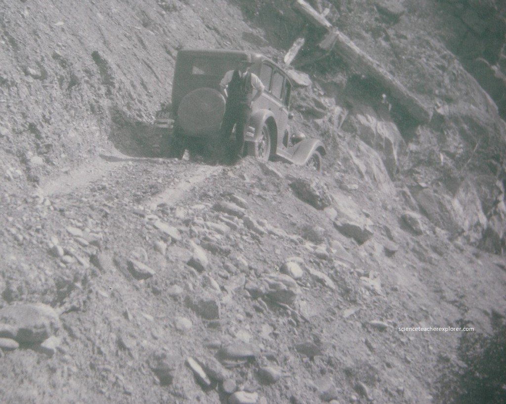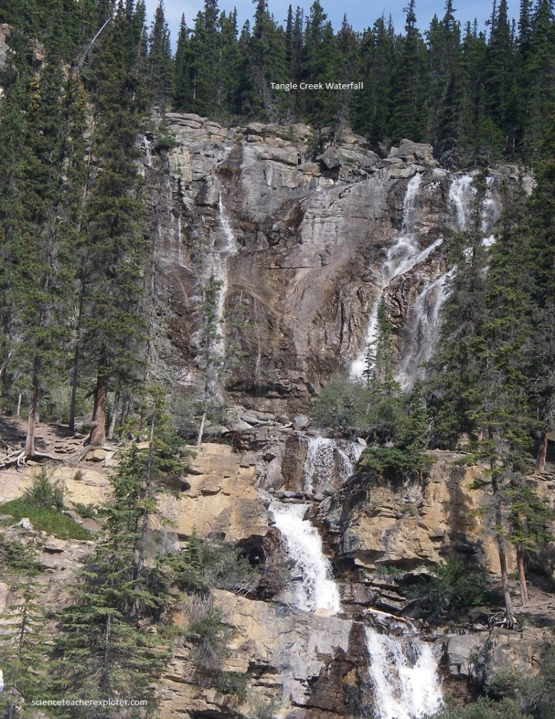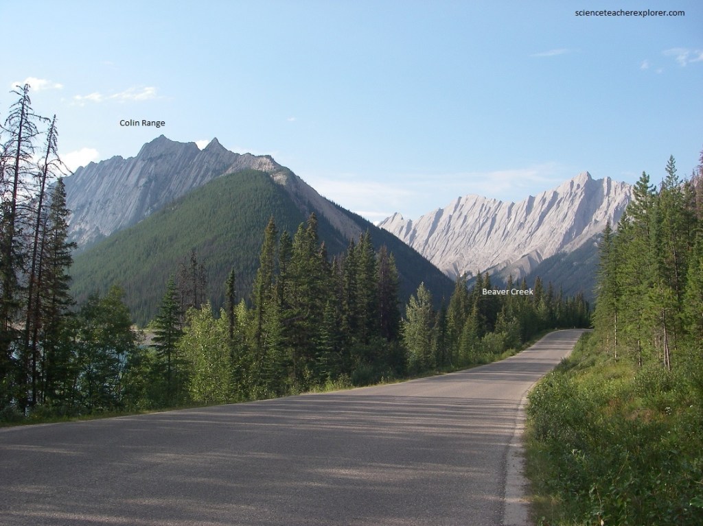 Pictured above, Beauty Creek is a fast-flowing mountain stream which rises in the valley behind Tangle Ridge, then falls precipitously to the level of the Sunwapta River. The above photo shows a deep canyon cut in limestone, with numerous waterfalls, one after another. The massive grey limestone in the base is of middle Cambrian age and the upper slopes are upper Cambrian and Ordovician rocks. One rock bed, well up the mountain, makes a distinctive brownish scree slope and is topped by more massive, spiky, flat-lying limestone.