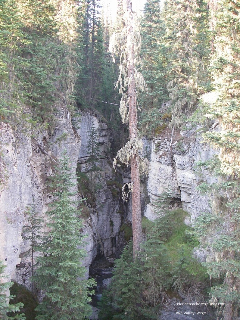 Pictured above, the road along the valley of the Maligne River below Medicine Lake is cut principally in the limestones of the Palliser Formation. This is natural because the valley would be expected to follow the general strike of the rock structures in the area. Pictured above from the bridge over the Two Valley Creek, affords a view of another of the many steep-walled gorges cut into the limestones of these mountains. You can see from its shape that the gorge has been cut by a combination of abrasion or wearing away by mechanical action, and solution, which produces rounded surfaces. Remnants of potholes are visible in some places. The bottom of the canyon is perpetually gloomy, with the constant rumbling of falling water. To the left, forests and smaller vegetation cling to the grey dip slopes of the limestone beds.