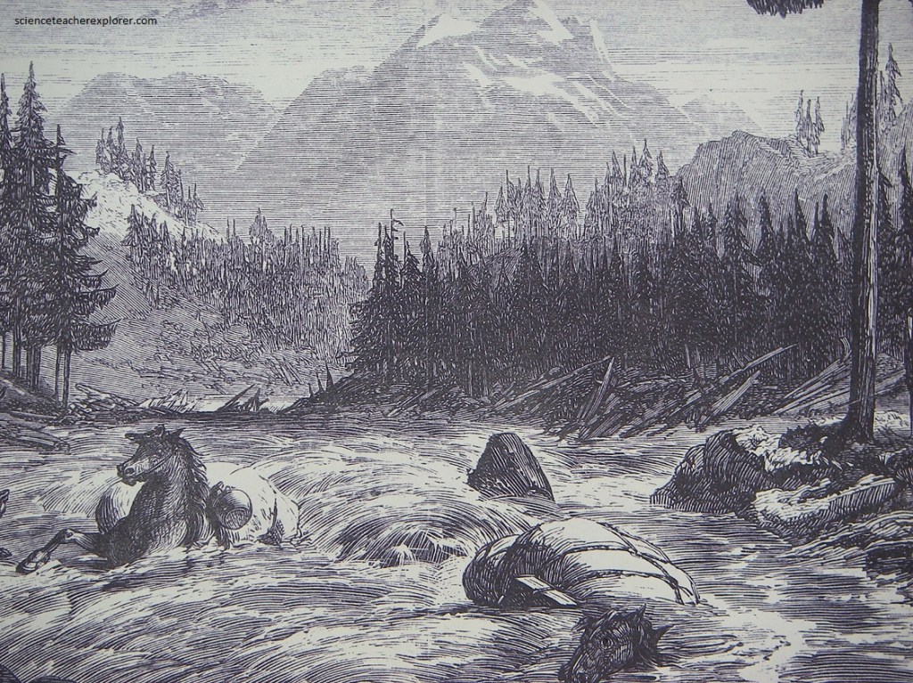 Imaged above and pictured below, at the foot of Mount Kerkeslin the Athabasca River plunges over a cliff of Precambrian quartzites into a narrow canyon of its own cutting. High above in the background looms Mount Kerkeslin with its gently down-bowed sedimentary rocks. Wooded slopes reach partly up its flanks, giving way there to bare scree or talus. Above this the Precambrian and Cambrian quartzites lie layer upon layer to the very peak. Notice in the picture below, two bright red layers in the lower part of the cliff just above the tree line on the left or northwest face of Mount Kerkeslin. These contain abundant iron oxide or hematite which gives them their color. Look at the pattern of gullies and ridges in the southwest face of Kerkeslin with occasional slide areas extending down into the woods. Note that Mount Kerkeslin thrusts its synclinal mass of rocks some 9,800 meters above sea level and gives way to the east the evenly dipping, rusty rocks of Mount Hardisty.