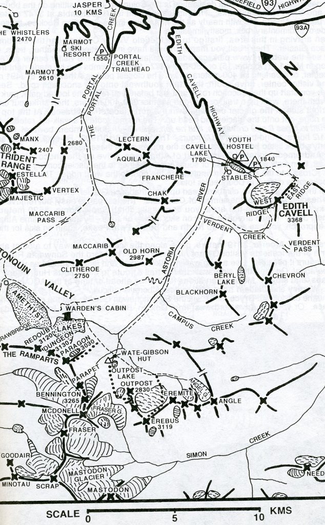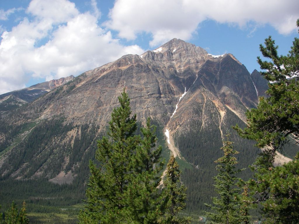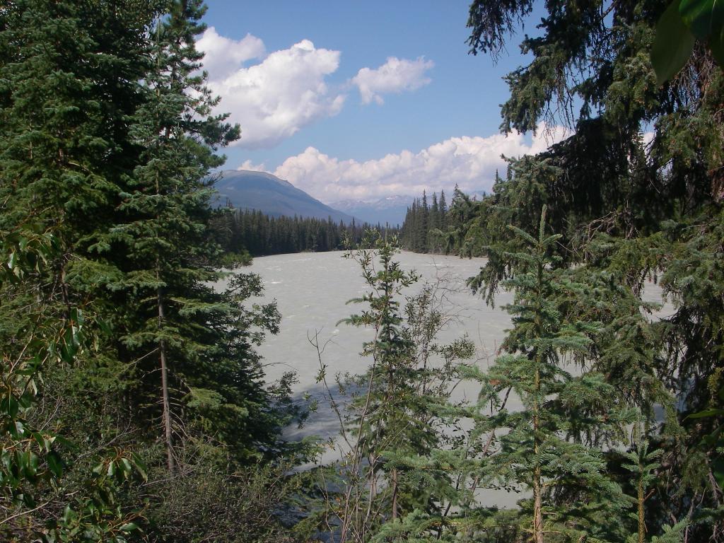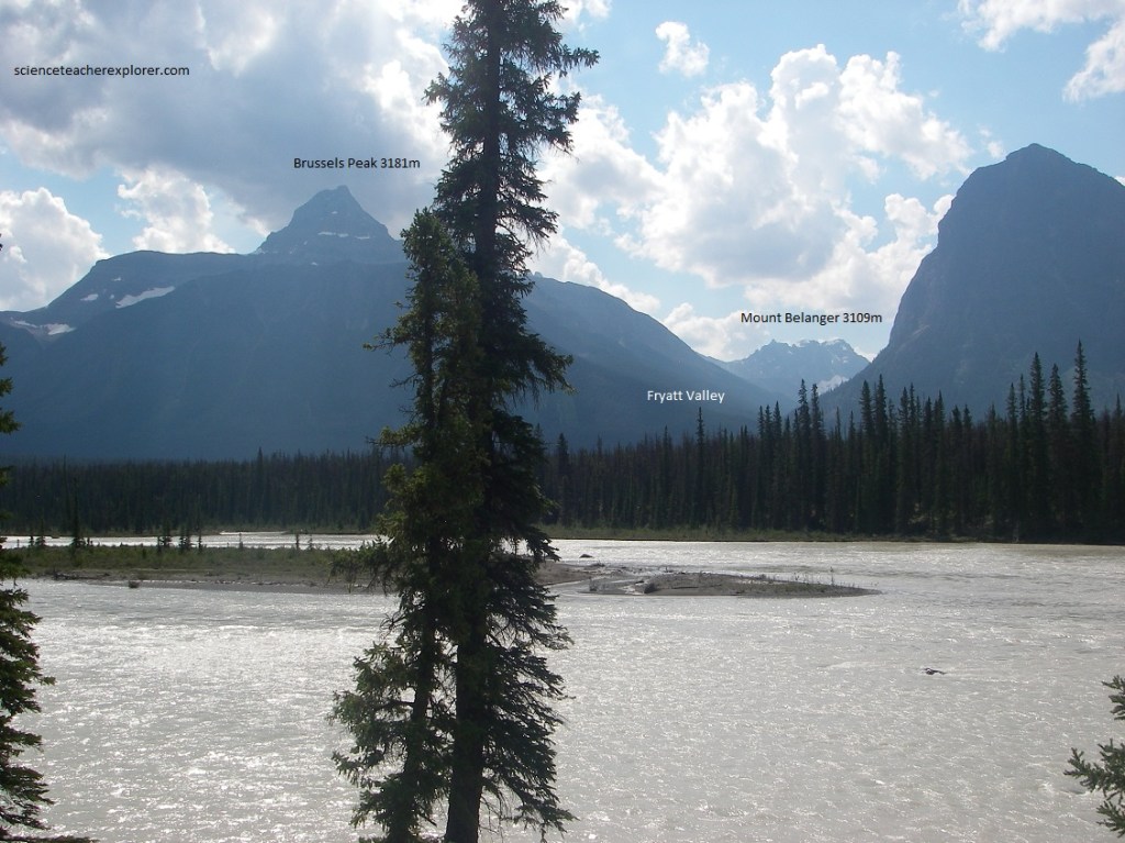 Pictured above, one can see for many kilometers up and down the wooded Athabasca River valley with the full spread of the high mountains and Fryatt Valley on the other side. Pictured immediately below, the Athabasca River flows swiftly but not violently on its way, forming islands in some places, cutting into banks and leaving deposits on others. The mountains opposite are cut into a great thickness of Pre-Cambrian and Cambrian quartzite that grades upward into limestone. To the left of Fryatt Valley, lies Mount Christie (hidden behind the tree), with small glaciers on its front. Behind Mount Christie on the same ridge lies the steep-walled Brussels Peak, looking rather like the funnel of a large ship.