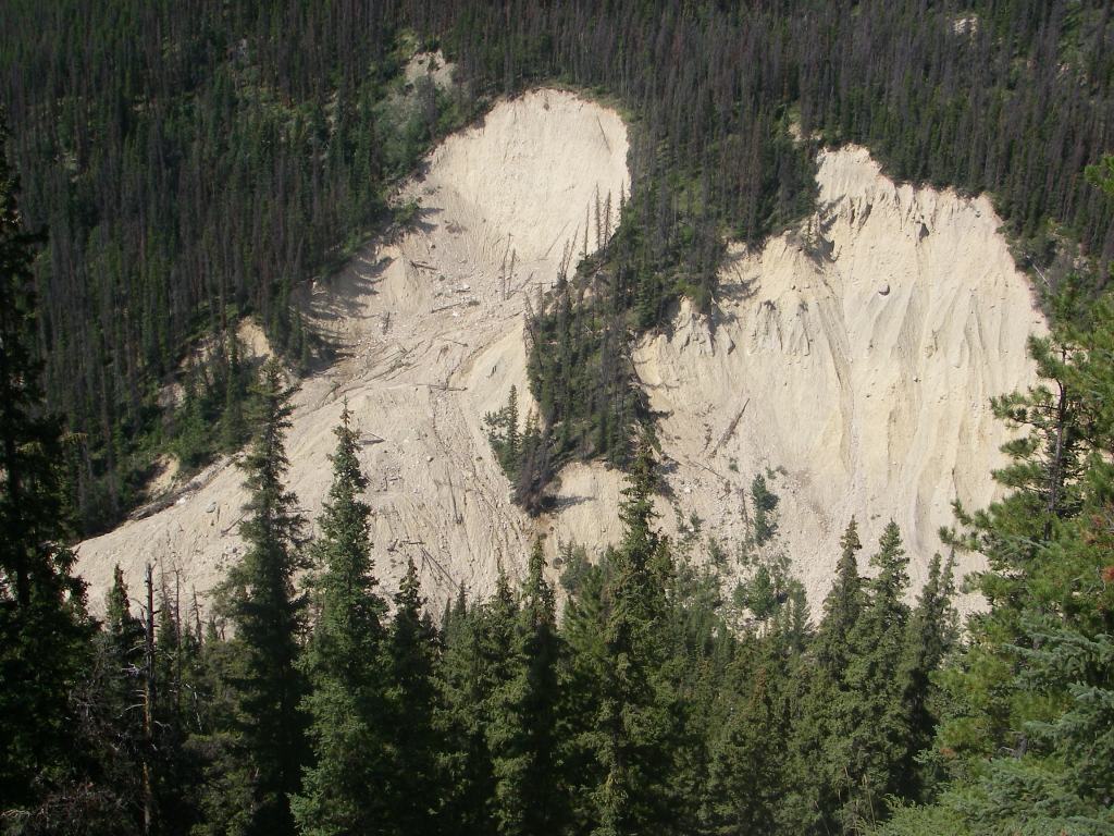Pictured above, at and across from this viewpoint, a great plug of glacial deposits has been cut through by the Astoria River. The boulders in the deposits are slightly rounded and a faint banding can be seen in the cliff opposite, suggesting that these are water-worn deposits, perhaps laid down in meltwaters in front of or beside a tongue of ice that once occupied the Astoria River valley. When dry, this mixture of boulders, sand, and clay seems fairly strong, but when wet it is probably soft and almost fluid so that land slips are frequent, as shown in the bank on the other side of the river. The material is eroded rapidly and irregularly so that some pillars are left, as in the cliff immediately below the viewpoint.