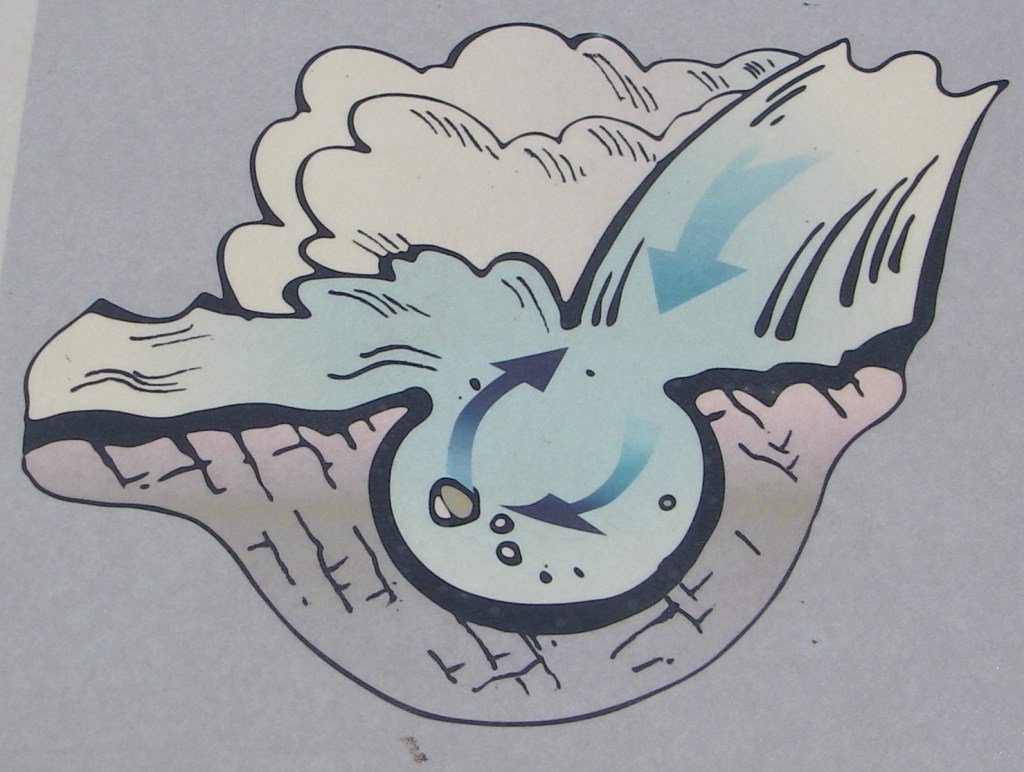 Imaged below, recipe for a pothole. First, trap sand or gravel in a depression. Add water that whirls it around and around, scouring the bedrock. Leave until the depression deepens and becomes rounder. The pothole is done when the water changes its course. Trapped and spinning water’s direction, particles of sand, silt and gravel carve like a diamond drill. The river took thousands of years to drill the potholes now suspended on the canyon walls.