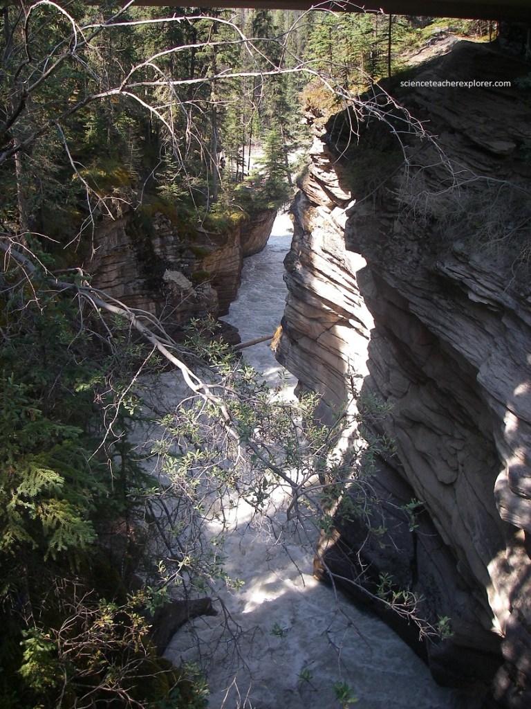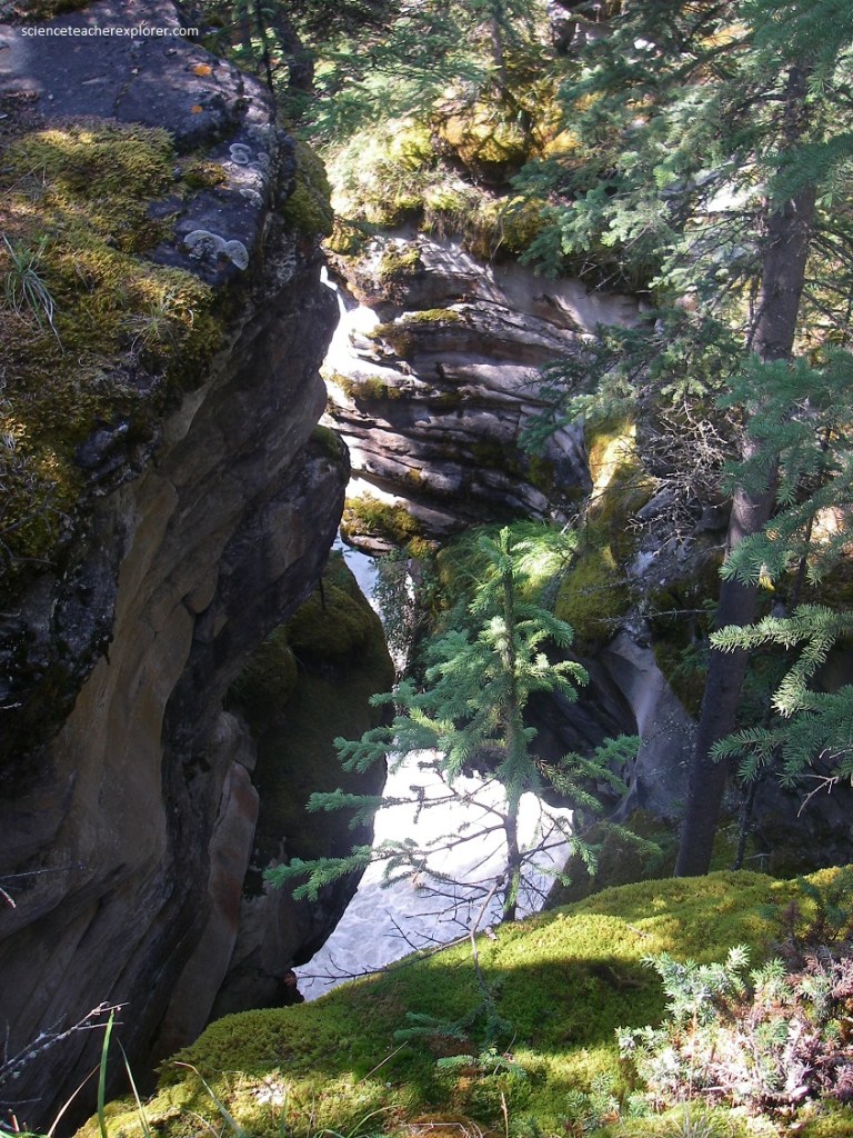 Imaged above and pictured below, a stream flowing underneath the glacier started forming the canyon. As the glacier receded, the Athabasca River took over and continues whittling away a few millimeters of rock each year.