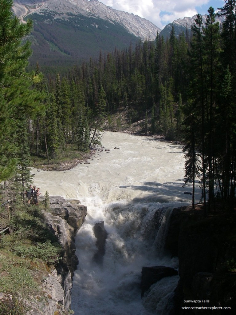Pictured above, the rocks at the falls and in the upper part of the canyon dip very gently, for this region is very close to the bottom of the trough or synclinal fold in the area. [After about 2 km of turbulent flow and other falls, the Sunwapta River reaches the valley flat of the Athabasca River, which comes from the south and joins it a little farther on.