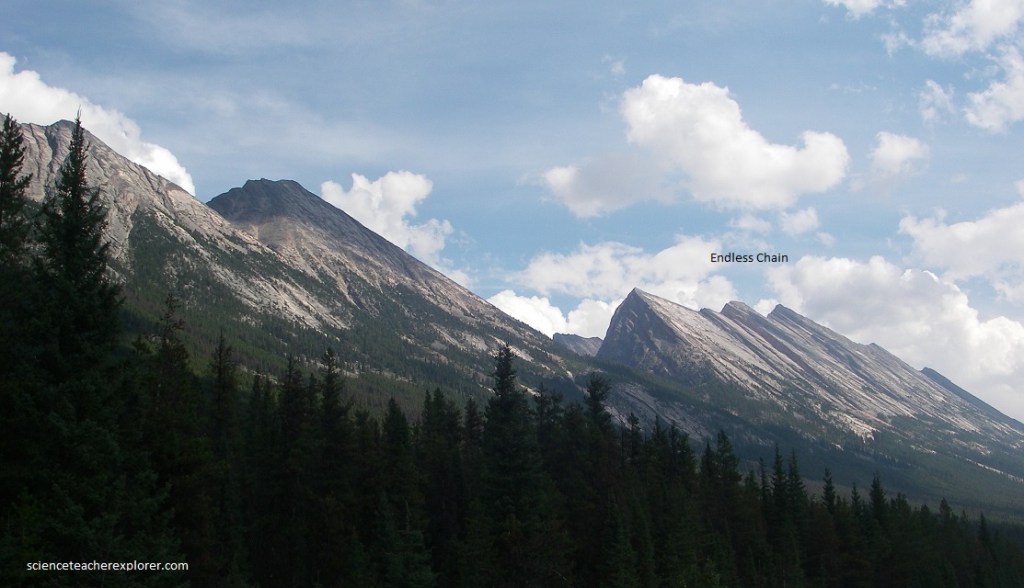 Pictured above and below, the several peaks with glaciers and snow patches are in the Churchill Range with Mushroom Peak and its spurs prominent to the south. At this location, the Icefields Parkway is close to the axial part of a syncline or downfold; that is, close to the very bottom of the trough of rocks that dip in from each side toward the center. On the the eastern side, great dip slopes of pink quartzites from the flanks of the Endless Chain Ridge. On the other side of the valley and on the side of the trough or syncline, the crests of the mountains are in rocks that clearly dip toward Banff-Jasper highway.