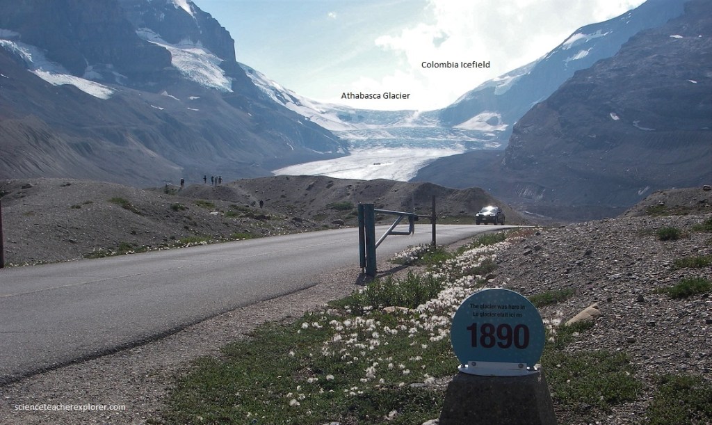 Pictured above, a superb view of mountains and glaciers is presented from the Columbia Icefield parking area. To the west and southwest a great tongue of ice, the Athabasca Glacier, issues from the Columbia Icefield over three great icefalls which appear like terraces at its back. To the left, a very sharp ridge stands high above the surface of the present ice. This represents an accumulation of debris that was scraped and pushed along the side of the Athabasca Glacier when it was much larger than it is now (2022). Irregular mounds of debris in the foreground also tell of its once-greater extent. Some believe this to have been at the most recent ice maximum, which took place about 1890. Since then the melting has been greater than the addition of ice from the back so that the glacier has gradually shrunk from these marginal and terminal ridges to its present position.