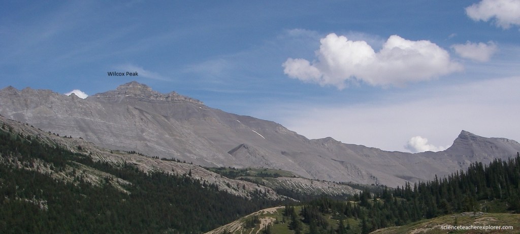 Pictured above, a superb scree or talus slope lies on the flank of Wilcox Peak to the northeast, and because it accumulates by the falling of debris from above, its boulders provide a complete sampling of the rocks in the upper parts of the mountain. The profile of Wilcox Peak shows a very steep wall on the side, (the result of cutting by glaciers that filled the valley).