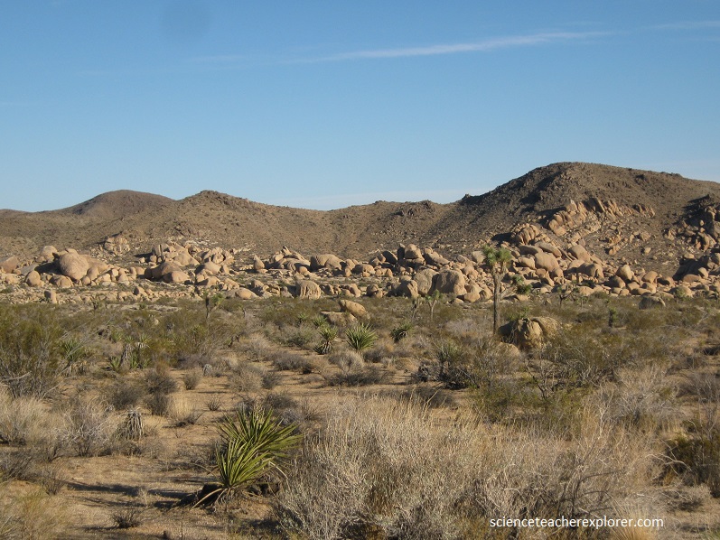 The Joshua Tree National Park encompasses some of the most interesting desert geomorphic features in California. Rugged mountains, prominently exposed granitic monoliths, and exposed fault scarps reveal how geologic processes shaped, and continue to shape, the stark desert landscape. Much of the Monument is above 1,300 m and steep mountain escarpments border this region to the north and south.