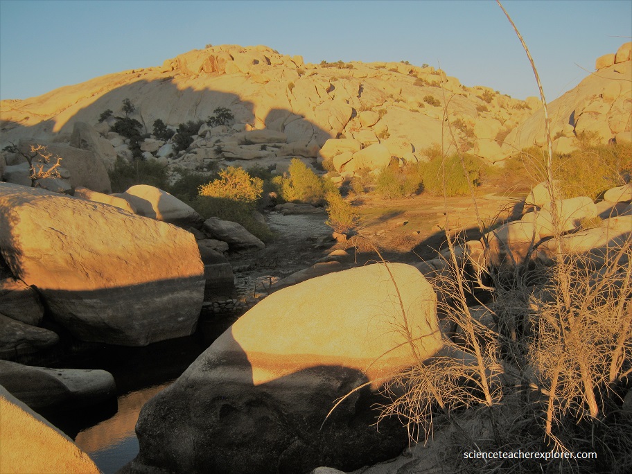 Pictured above, in the distance, are the bold White Tank monzonite boulders found near Jumbo Rocks Campground. These conspicuous outcrops provide an arresting landscape panorama. The rounded and eroded rock outcrops in the western region of the park were formed by erosive agents along joint planes (subparallel fractures) in this White Tank monzonite. This granitic unit is feldspar-rich and quartz-rich igneous rock that has characteristic joint sets that intersect at nearly right angles. Joints are fissures in rocks and commonly occur in recognizable patterns. Within the Park, joints have often formed parallel sets, and joints with two or more parallel sets, called “joint systems,” also occur. Joint patterns are easily observed in the White Tank monzonite.