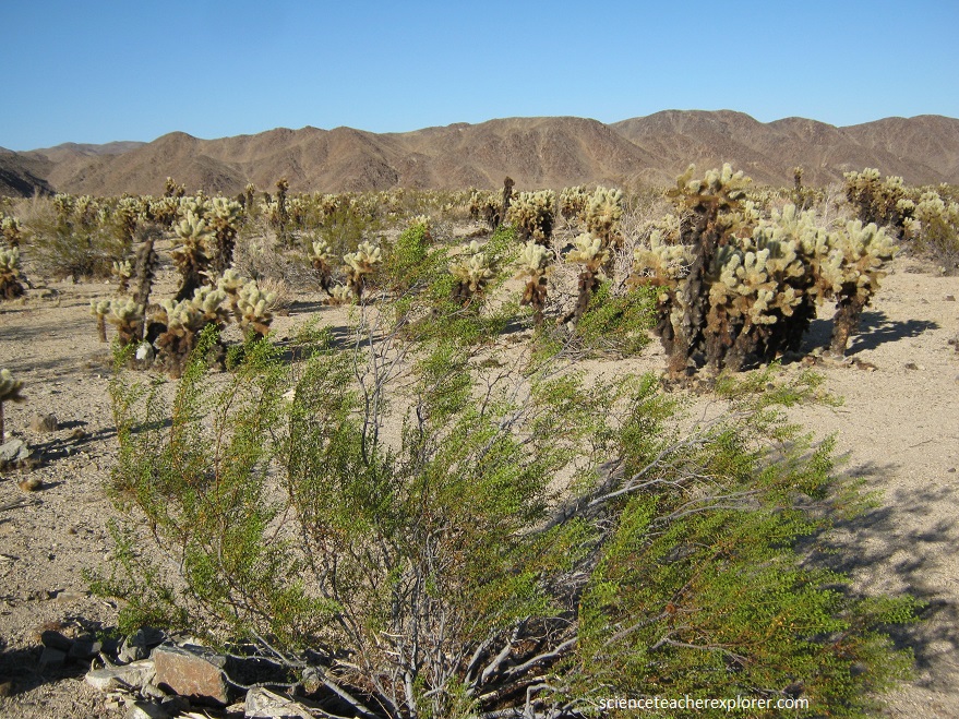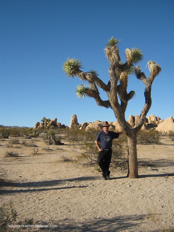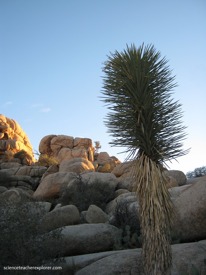 Joshua Tree National Park embraces two desert types: the Colorado and the Mojave Desert. The Colorado has creosote bush, ocotillo, and cholla cactus, (pictured above). The Mojave has Joshua Tree forests, (pictured below). Joshua trees grow at elevations of 650 m to 2,000 m and have keenly pointed bayonet-like leaves that bristle at the end of large club-like branches. Until young Joshua trees attain a height of two meters, their trunks have leaves that reach the ground. As the plant ages and grows in height, these first leaves droop, die, and become closely pressed into a thatch-like mat that covers the trunk and limbs. Some trees have reached heights of 18 m.