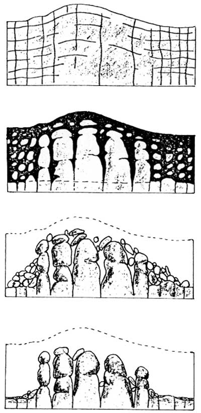 Three dominant joint sets produced spectacular rock forms in this unit (imaged above). One joint set is oriented horizontally and was caused by the release of pressure when the thick layer of original overlying rocks was removed by extensive erosion. Another set of joints in the White Tank monzonite occurs vertically and roughly parallels the contact of this unit with surrounding rock units. The third joint set in the White Tank monzonite is also vertical but is approximately perpendicular to the other vertical set. This system of joint sets results in the rectangular-shaped blocks that can be observed around Jumbo Rocks Campground and Squaw Tank.