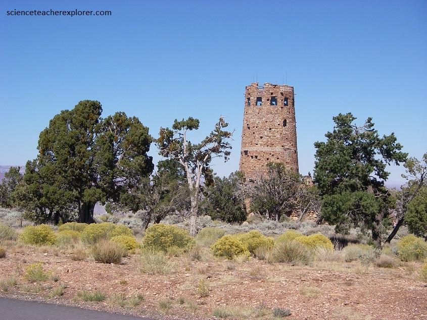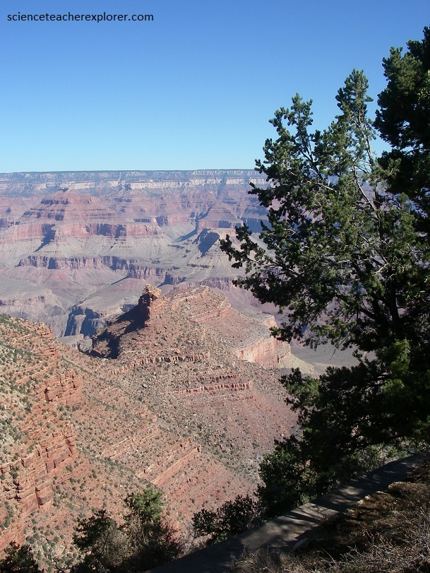 The Grand Canyon is about 1.6 km deep and 15 kilometers wide, and it runs for a staggering 450 km across two states. It’s striped walls change color with the passing day, (silver-gold in the morning, muted browns at midday, deep crimson at sunset, and a cool indigo in moonlight). So we were in for a visual treat. Pictured above on the rim, the Kaibab Formation averages about 250 million years old and forms the surface of the Kaibab and Coconino Plateaus. It is composed primarily of a sandy limestone with a layer of sandstone below it. In some places sandstone and shale also exists as its upper layer. The color ranges from cream to a greyish-white.