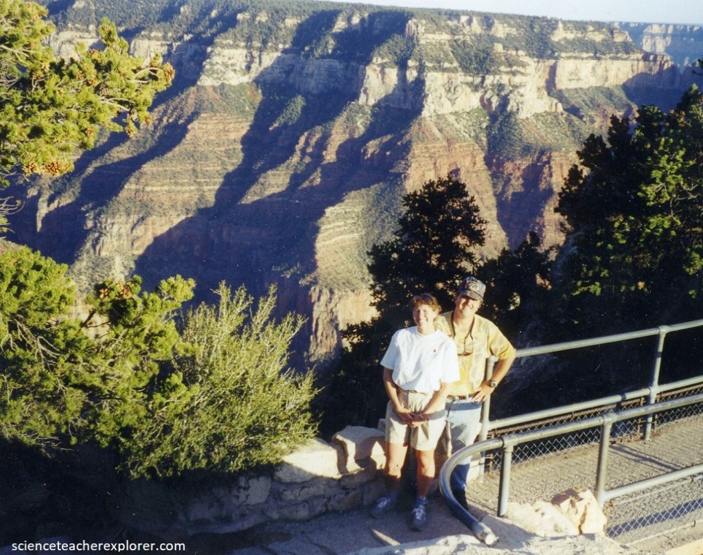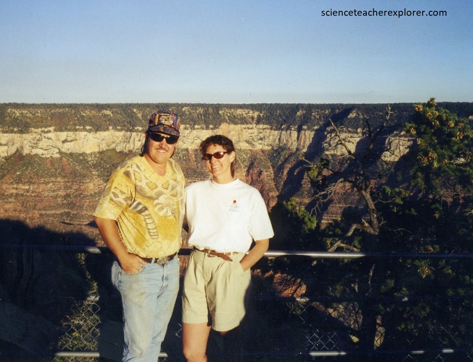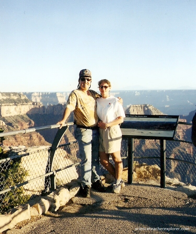 Our first view of the Grand Canyon from the North Rim is astonishing, (multi-colored rock towers, buttresses, and terraces drop into the hidden depths, then rise again in an even greater tangle to the dark edge of the South Rim, a long, long way away), to either side the twisting chasm stretches out to the hazy horizon, (pictured below).