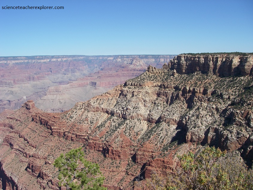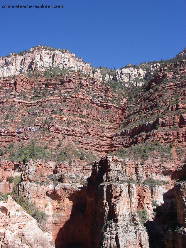 Pictured above, below the Kaibab Formation is the Toroweap Formation layer that averages about 255 million years old and is composed of pretty much the same material as the Kaibab Limestone above. It is darker in color, ranging from yellow to grey. Below that, is the Coconino Sandstone layer that averages about 260 million years old and is composed of pure quartz sand, which are basically petrified sand dunes. Wedge-shaped cross bedding can be seen where traverse-type dunes have been petrified. The color of this layer ranges from white to cream colored. Lastly seen in the photo is the “Hermit Shale layer that averages about 265 million years old and is composed of soft, easily eroded shales which have formed a slope. As the shales erode they undermine the layers sandstone and limestone layers above which causes huge blocks to fall off and into the lower reaches of the Canyon. Many of these blocks end up in the side drainages and down on the Tonto Platform. The color of this layer is a deep, rust-colored red and found at the bottom of the picture.