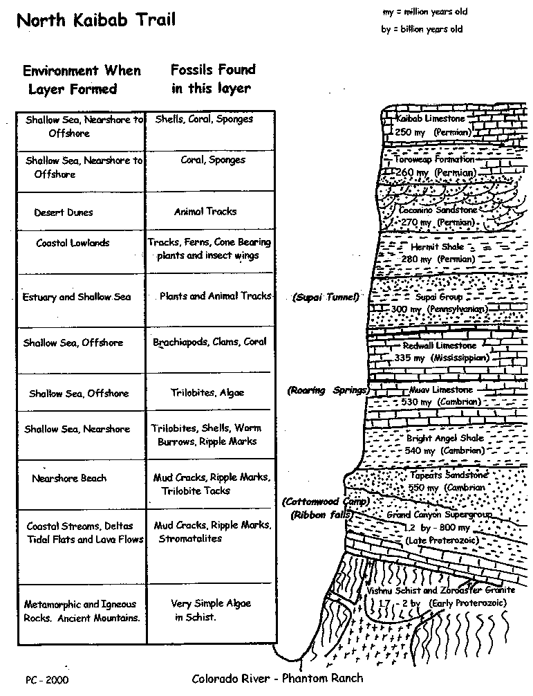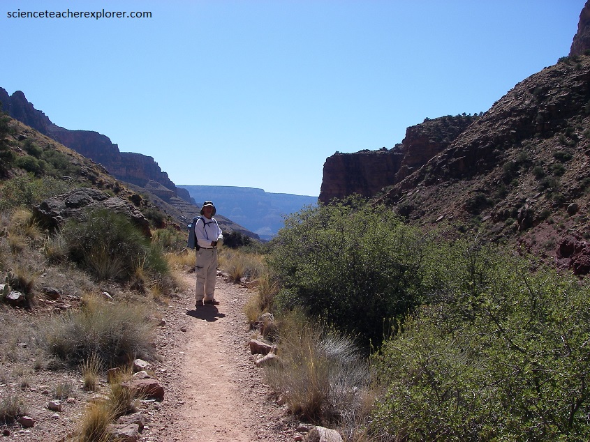 The Roaring-Springs Canyon widened as we left the huge jutting ramparts of the Roaring-Springs cliffs and the falls on our left. Eventually, we reached the junction, where the Kaibab trail turns right down Bright-Angel Canyon. The original Kaibab Trail, (now known as the Old Kaibab Trail), first traveled in 1902, continued down Bright Angel Canyon from the North Rim on the left of the confluence. This trail is not maintained. At the junction, we continued south for 3 km, slowly dropping beside Bright Angel Creek to Cottonwood Campground. Looking forward, we had an excellent view right down the Bright-Angel Creek Valley and then back up to the South Rim, (pictured below). From the junction to Cottonwood Campground, we passed through the Bright Angel Shale. The Bright-Angel Shale layer averages about 530 million years old and is composed primarily of mudstone shale. It is also interbedded with small sections of sandstone and sandy limestone. The valley floor is much wider in this portion of the Canyon where the Bright Angel Shale contains less sand and is more easily eroded. The color of this layer varied with its composition but it is mostly various shades of green with some grey, brown and tan thrown in here and there.