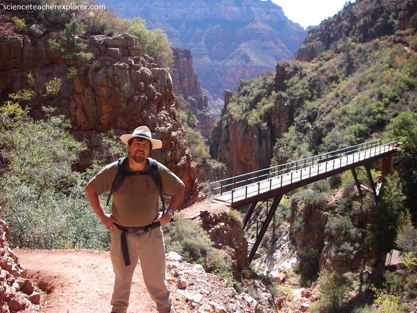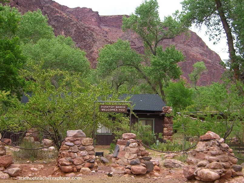 Trekking down Bright-Angel Canyon for 10 km from Ribbon Falls to Phantom Ranch, the trail drops gently beside a gurgling creek. There were superb views of red and yellow rock buttes rising high above. Lush vegetation lined the creek, in stark contrast to the sparse desert plants not far away. Much of the rock that we trekked over were Pre-Cambrian, (1.1 billion years old) and are found below the “Great Unconformity” of the Cambrian time. Just before we got to Phantom Ranch, the Kaibab trail wound through a narrow gorge, 370m deep, called “The Box”, where the trail was built by blasting away the Pre-Cambrian Igneous-Rock to avoid myriad creek fords. Pictured above, Phantom Ranch was set among the leafy cottonwood trees beside the sparkling waters of the Bright-Angel Creek, (a welcome shady spot after the harsh brightness of the desert).